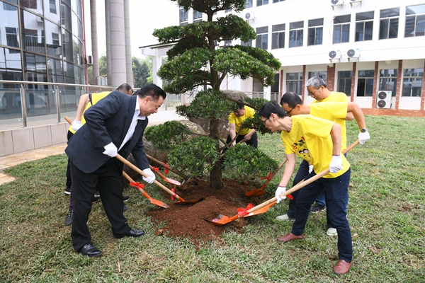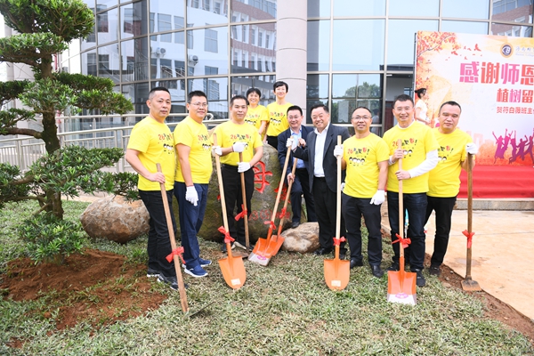 捐赠仪式结束后,校友们来到新建成的大学生活动中心,挥锹培土,提水浇灌,种下两株罗汉松,共同为校园增添一份绿意,也种下了对母校的深厚情谊。走在风景如画、生机勃勃的校园里,看到母校取得了如此大的发展成就,校友们感到由衷的高兴和自豪。