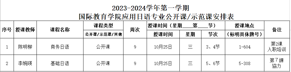 其次,下周周三(10月25日)上午三四节(1-604,22级日语2班)陈明柳老师的商务日语公开课,下午五六节(5-308,22日语3班)李婉瑛老师的基础日语(三)公开课,希望这两个时间段无课的日语教师积极过来学习观摩,一起磨课。