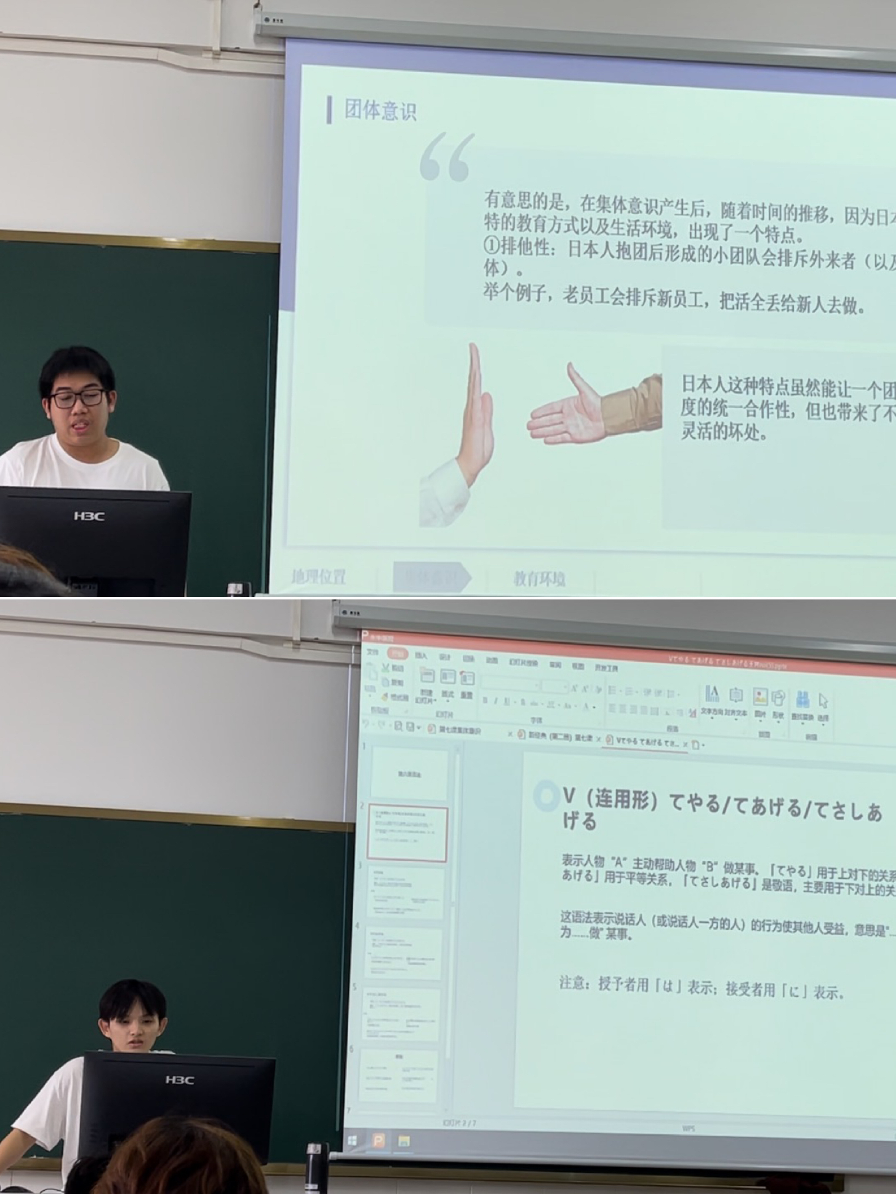 李婉瑛老师的课为基础日语课,围绕课文题目“協力”(合作),用集体主义导课,引导学生发散性思维,王路凯与大家共同探讨从地理位置的角度,展现日本人产生集体意识的背景原因,教学设计层层递进,激发学生思考,引导和发展学生的合作意识。