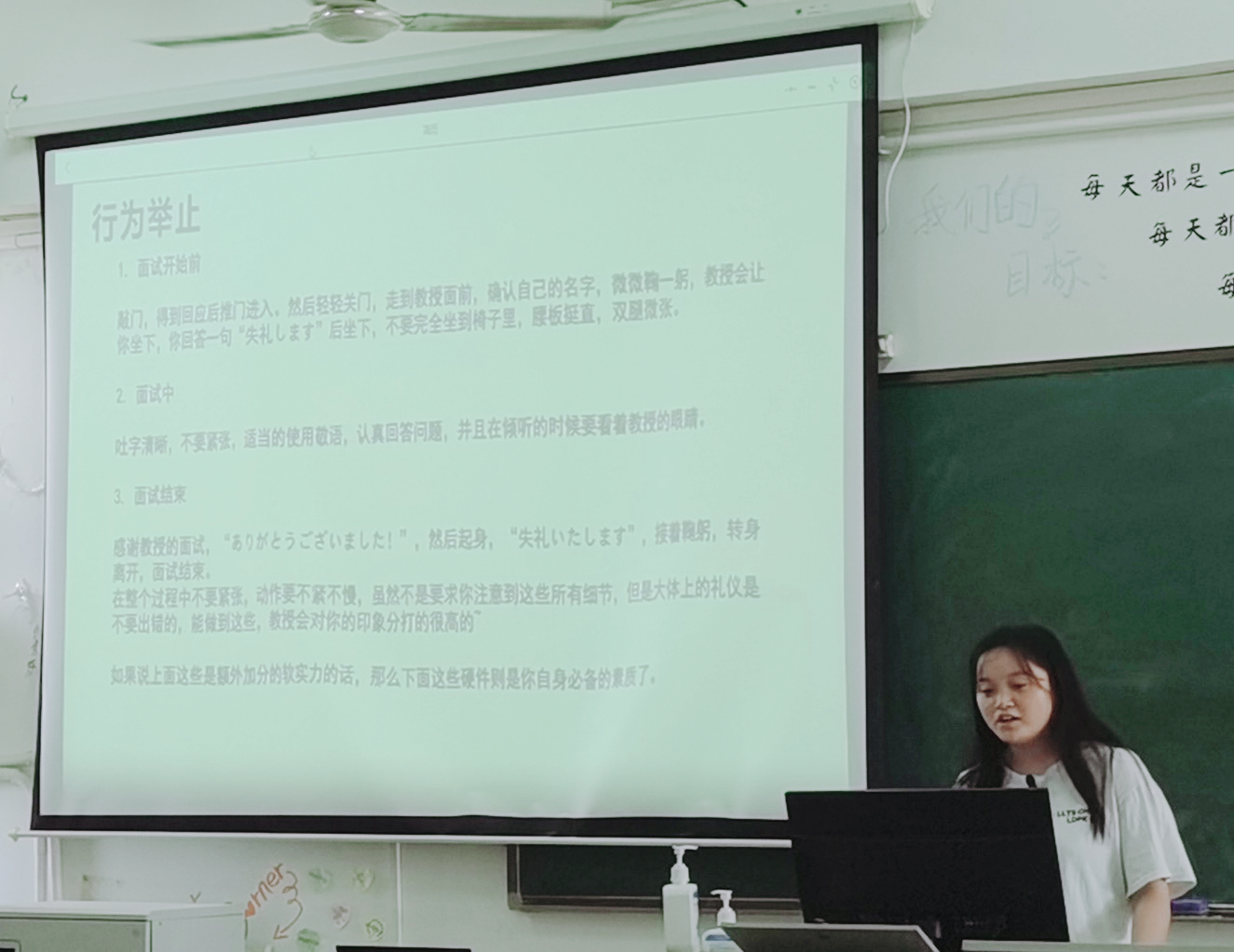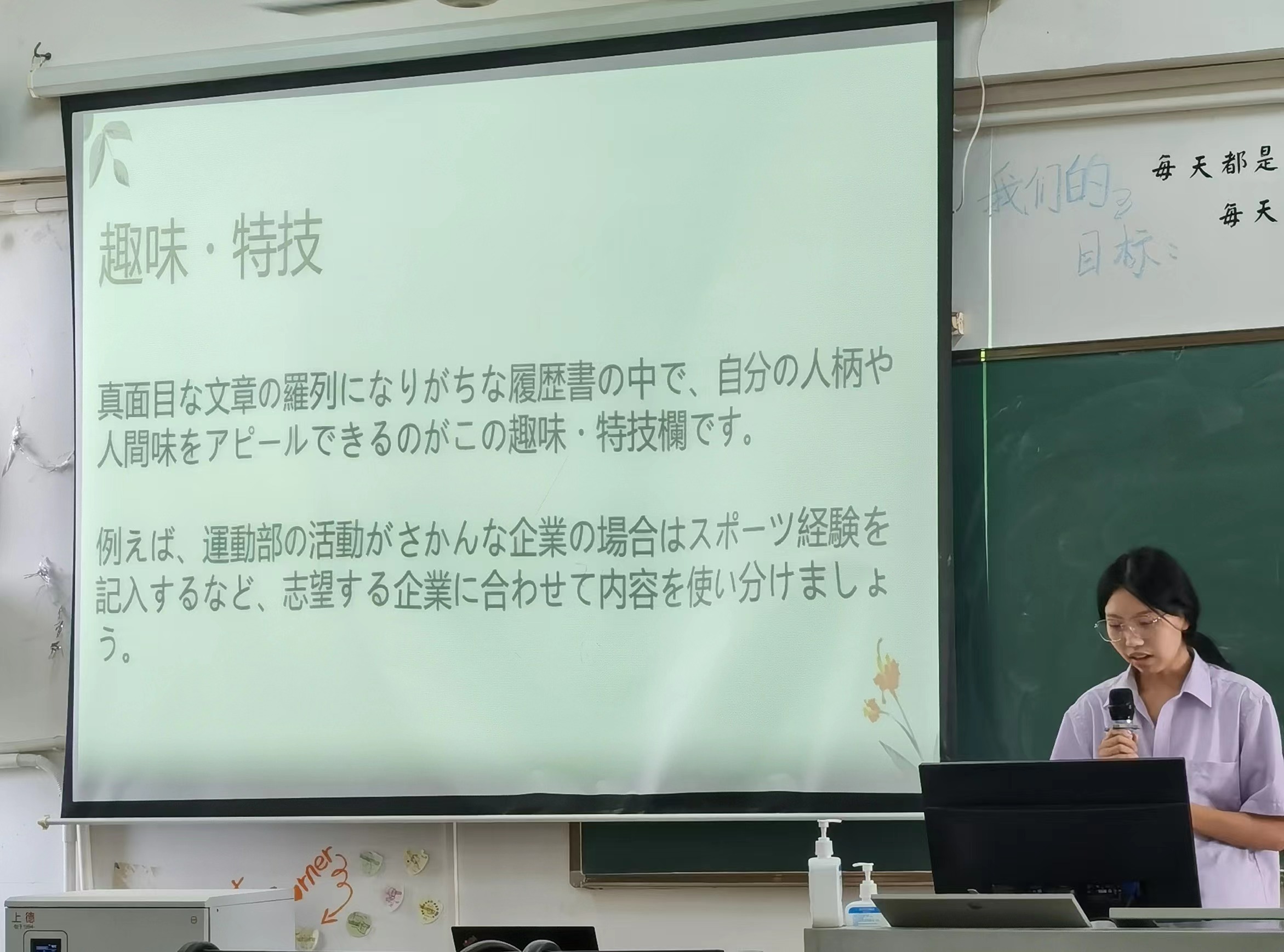 在这一次的商务日语双导向公开课堂上我们小组发表的课题是——同僚の会話(同事间的闲聊),本次我作为主讲人之一发表的是我们小组的前半部分的内容。主要是围绕商务类的单词和相关语法展开了讲解。平时我们在商务日语老师陈老师的课堂上学了很多有关商务类的表达,以此为基础结合进我们的发表里给大家分享了更多的商务类的知识点讲解。这次的课堂发表的机会也让我吸收了很多以前未涉及的日语知识。作为日语生,商务类日语,我们也应该对它有所了解,它能够在将来选择在日企工作的时候帮助我们更好地与日本客户沟通,还能够让我们在国际商务场合中展现出专业的形象。本次的发表不仅让我学到了很多同时也看到了自己的不足之处,但这也让我能更加一步完善自己的专业能力。也激发了我继续努力学习的动力。