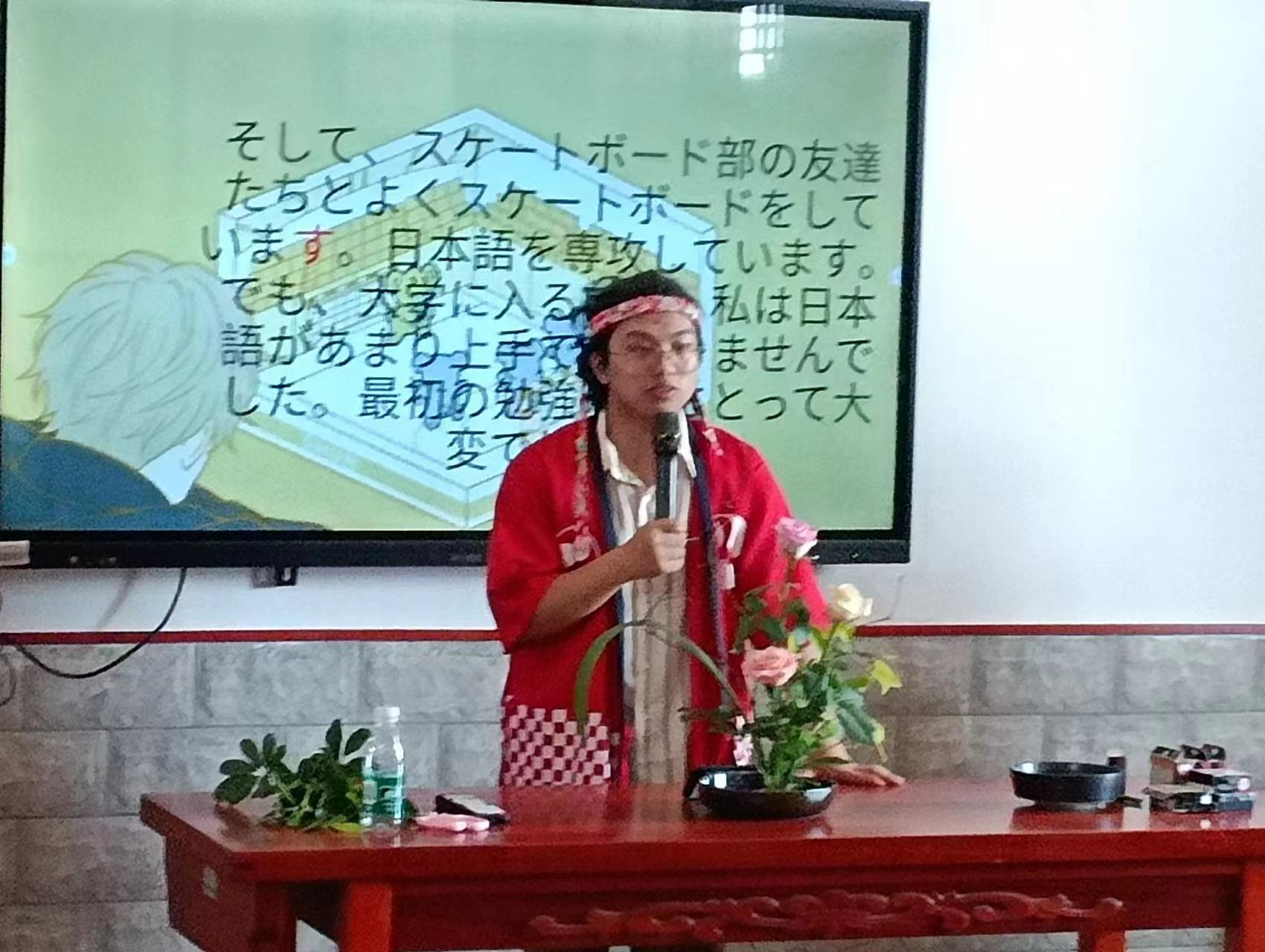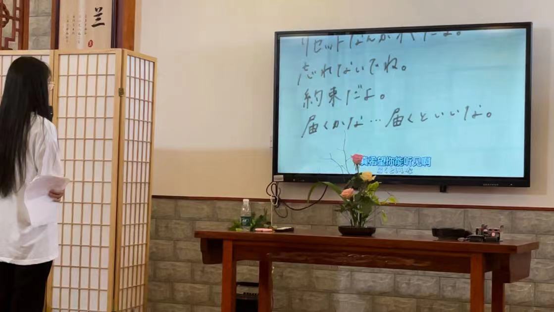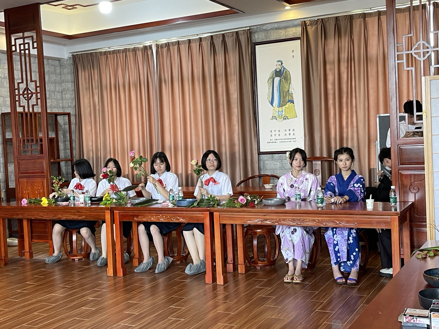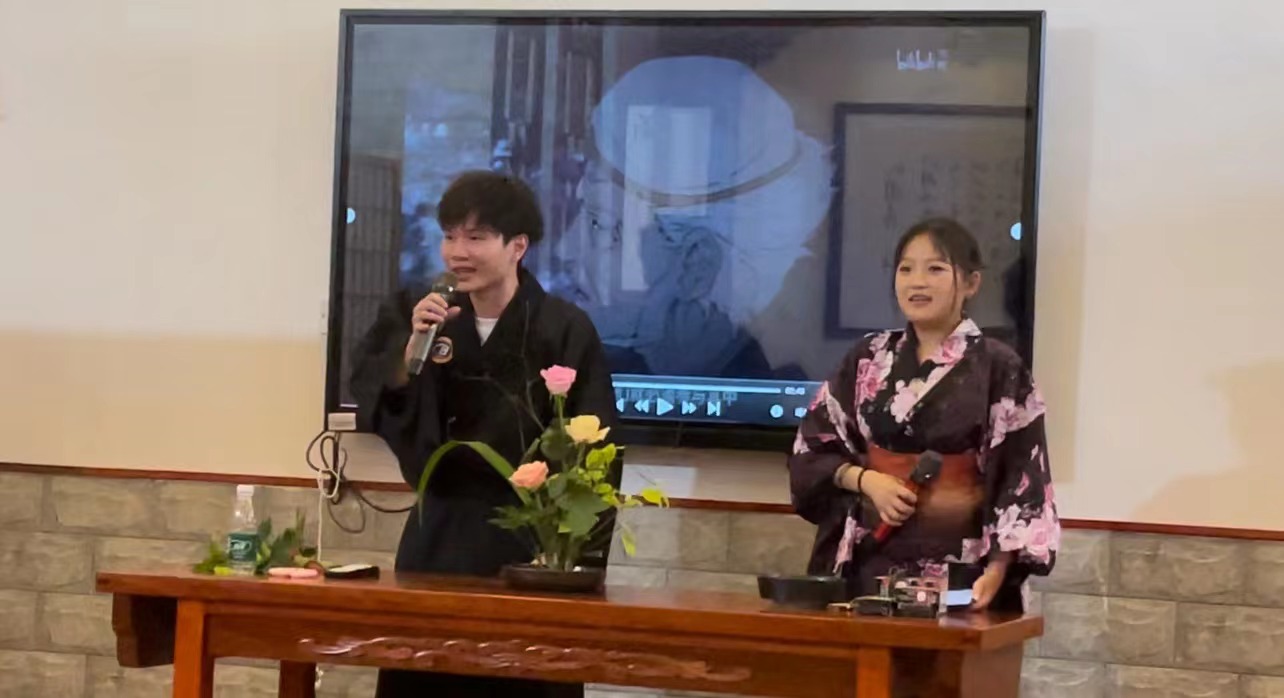 在海口旅游学校的学生前来614教室参加活动中,马娜为他们带去了激昂澎湃的日语演讲—《青春》。然后,林由惠老师为大家介绍了日本的插花艺术——華道,22日语1班张玉为林由惠老师担任日语翻译工作,精准而生动地为学生讲解插花艺术。