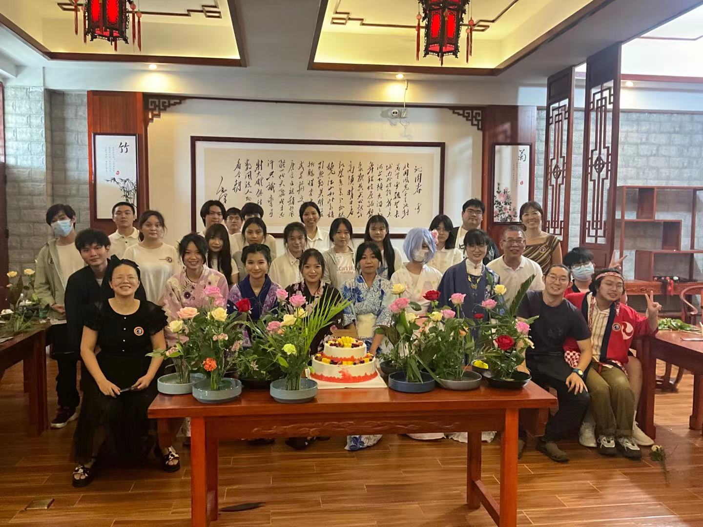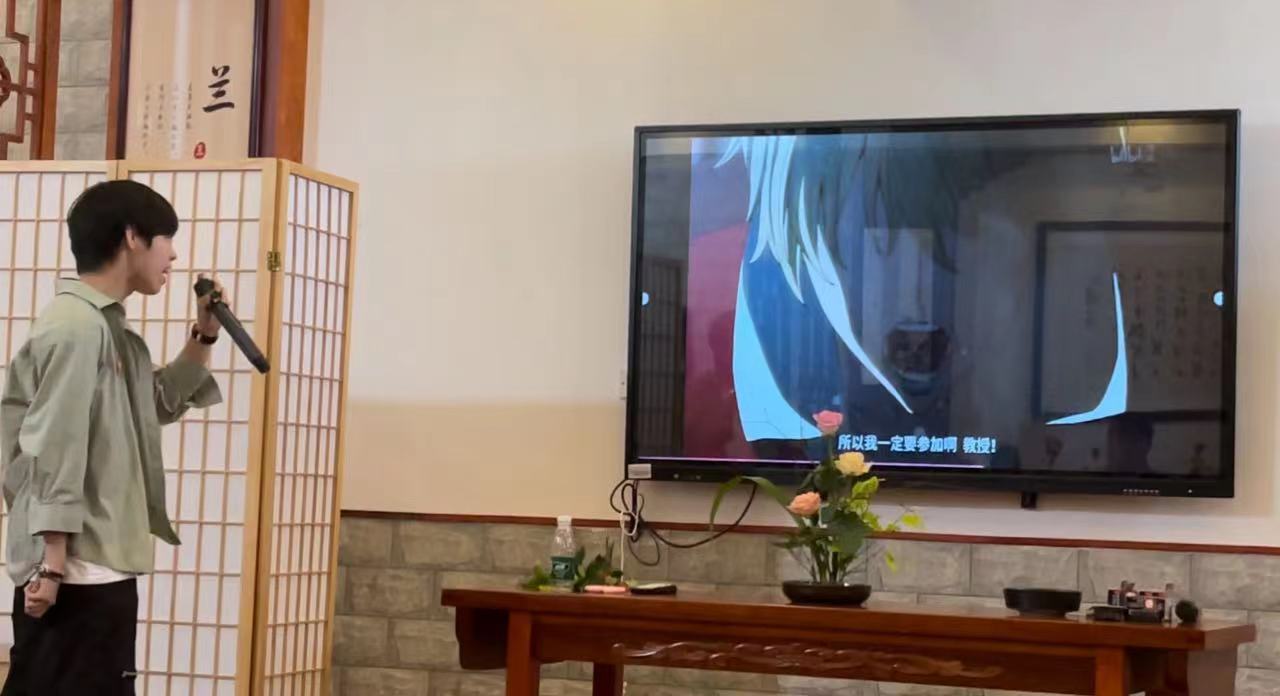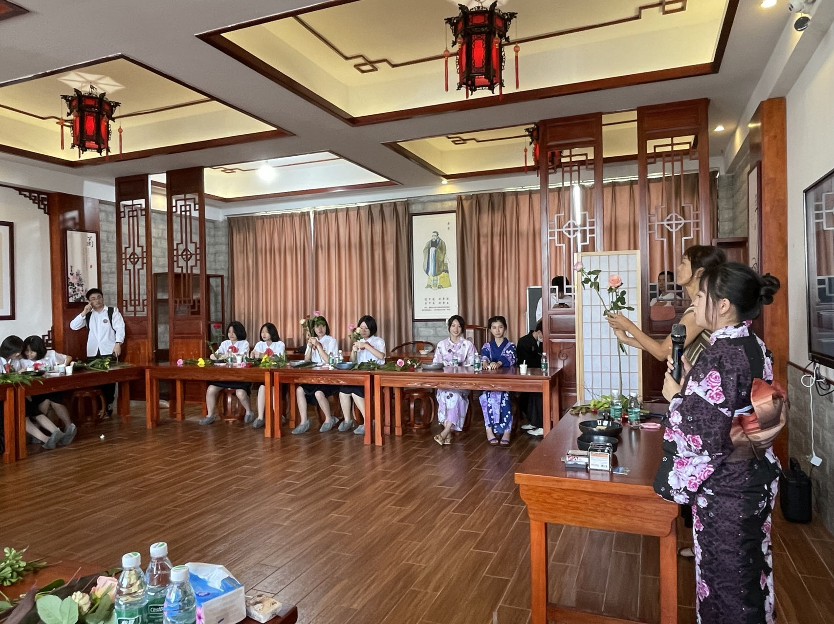 在海口旅游学校的学生前来614教室参加活动中,马娜为他们带去了激昂澎湃的日语演讲—《青春》。然后,林由惠老师为大家介绍了日本的插花艺术——華道,22日语1班张玉为林由惠老师担任日语翻译工作,精准而生动地为学生讲解插花艺术。