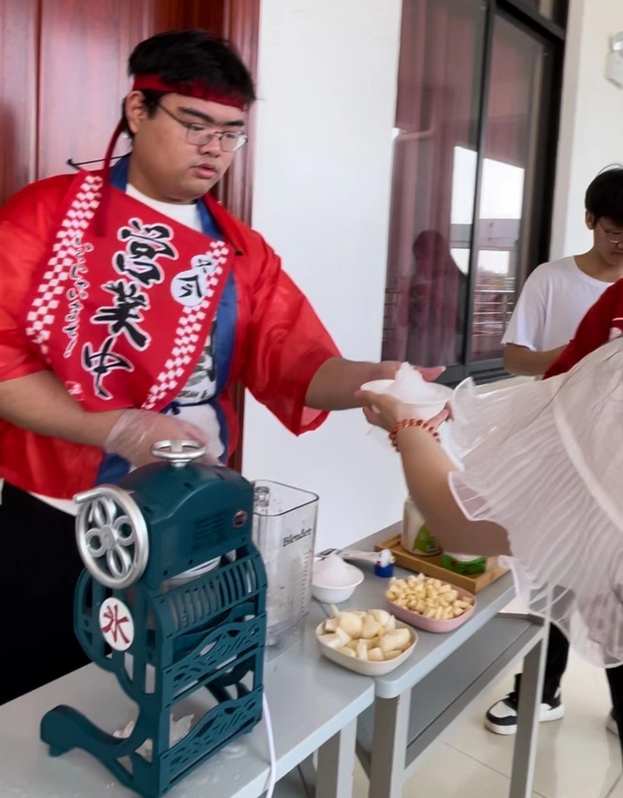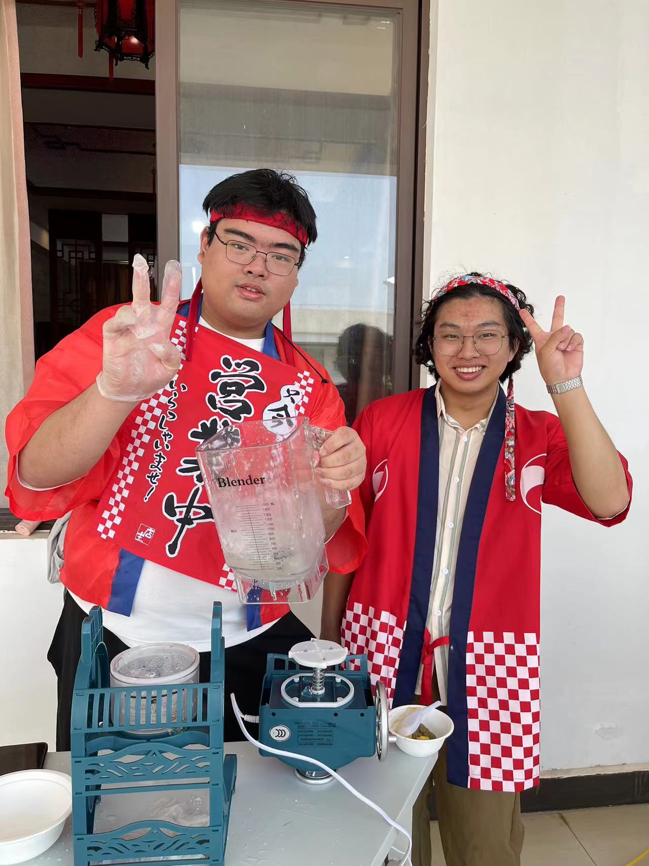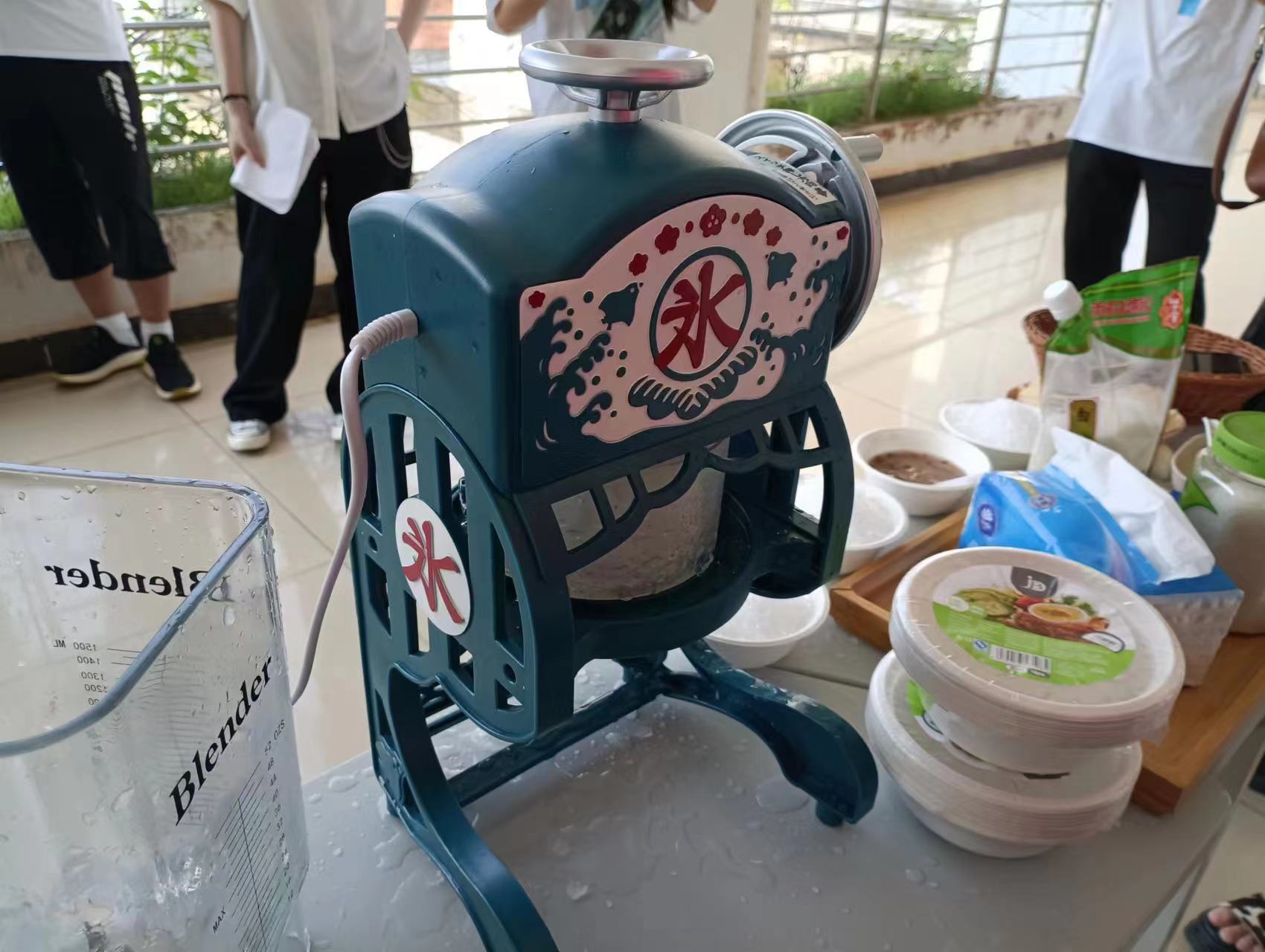 首先,同学们在1-614教室外搭建了日式刨冰摊位,摊位分为两个,一是传统刨冰摊位、一是果味刨冰摊位。在大家的努力和谷田老师的指导之下,刨冰志愿者们终于做出了酸甜适中、口味独特丰富、冰爽怡人的刨冰。炎炎夏日,在刨冰小组的同学们的吆喝声中,许多来参观体验日本文化的老师与学生光顾了我们的日式刨冰摊位,口味繁多的刨冰很快便供不应求,大家由起初的动作生疏逐渐转变成了配合默契。在忙碌之中,收获了众人的认可与赞美,更拥有了劳动的快乐。