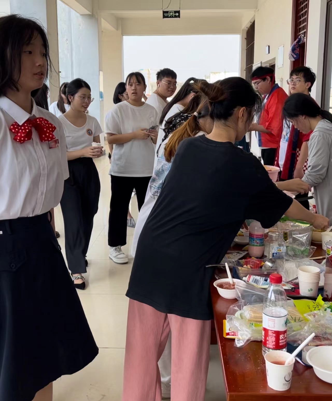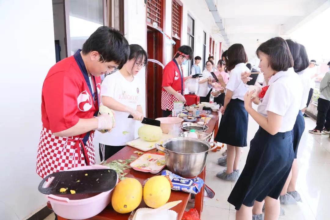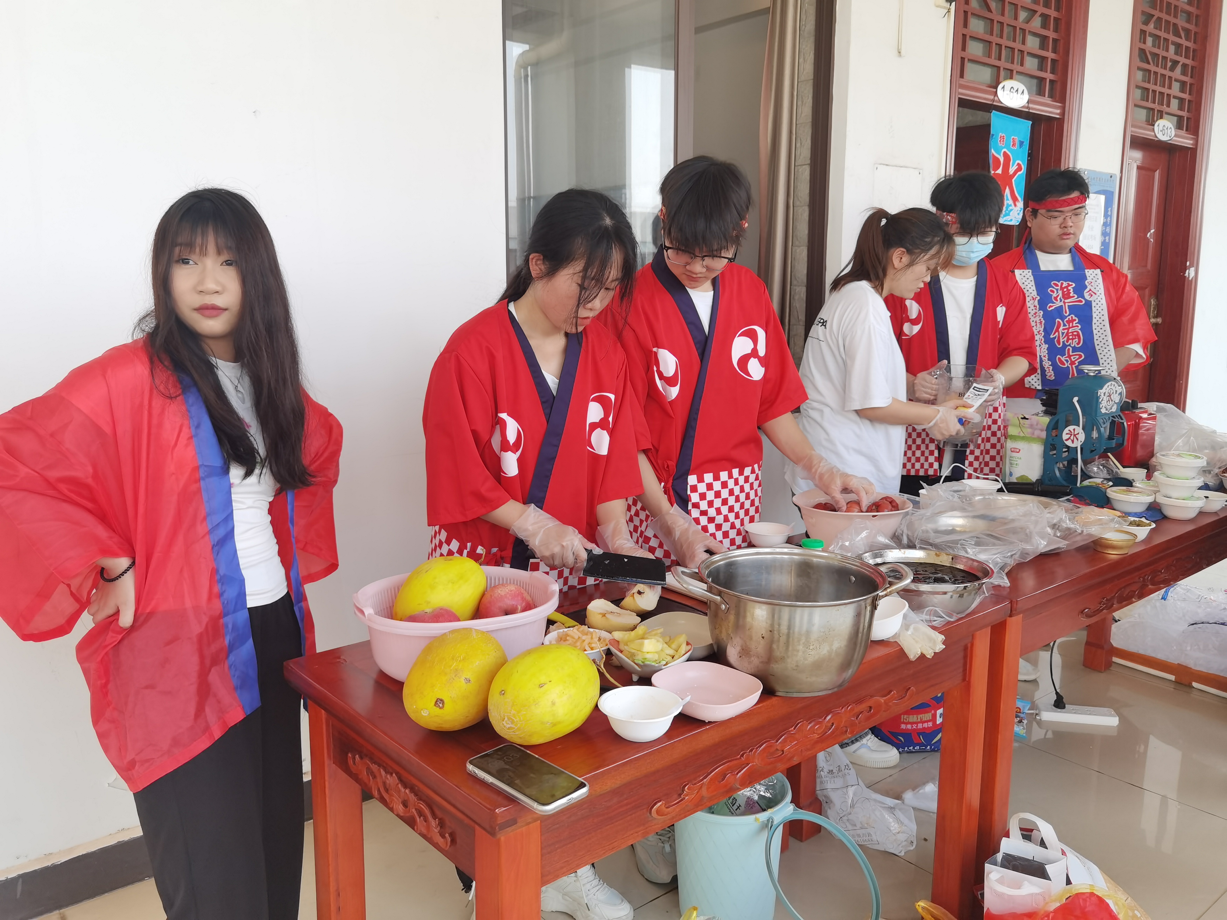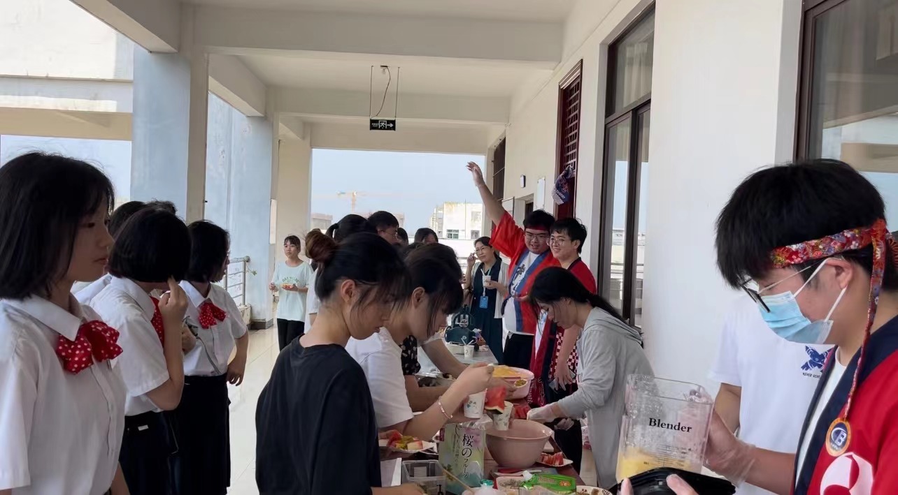 首先,同学们在1-614教室外搭建了日式刨冰摊位,摊位分为两个,一是传统刨冰摊位、一是果味刨冰摊位。在大家的努力和谷田老师的指导之下,刨冰志愿者们终于做出了酸甜适中、口味独特丰富、冰爽怡人的刨冰。炎炎夏日,在刨冰小组的同学们的吆喝声中,许多来参观体验日本文化的老师与学生光顾了我们的日式刨冰摊位,口味繁多的刨冰很快便供不应求,大家由起初的动作生疏逐渐转变成了配合默契。在忙碌之中,收获了众人的认可与赞美,更拥有了劳动的快乐。