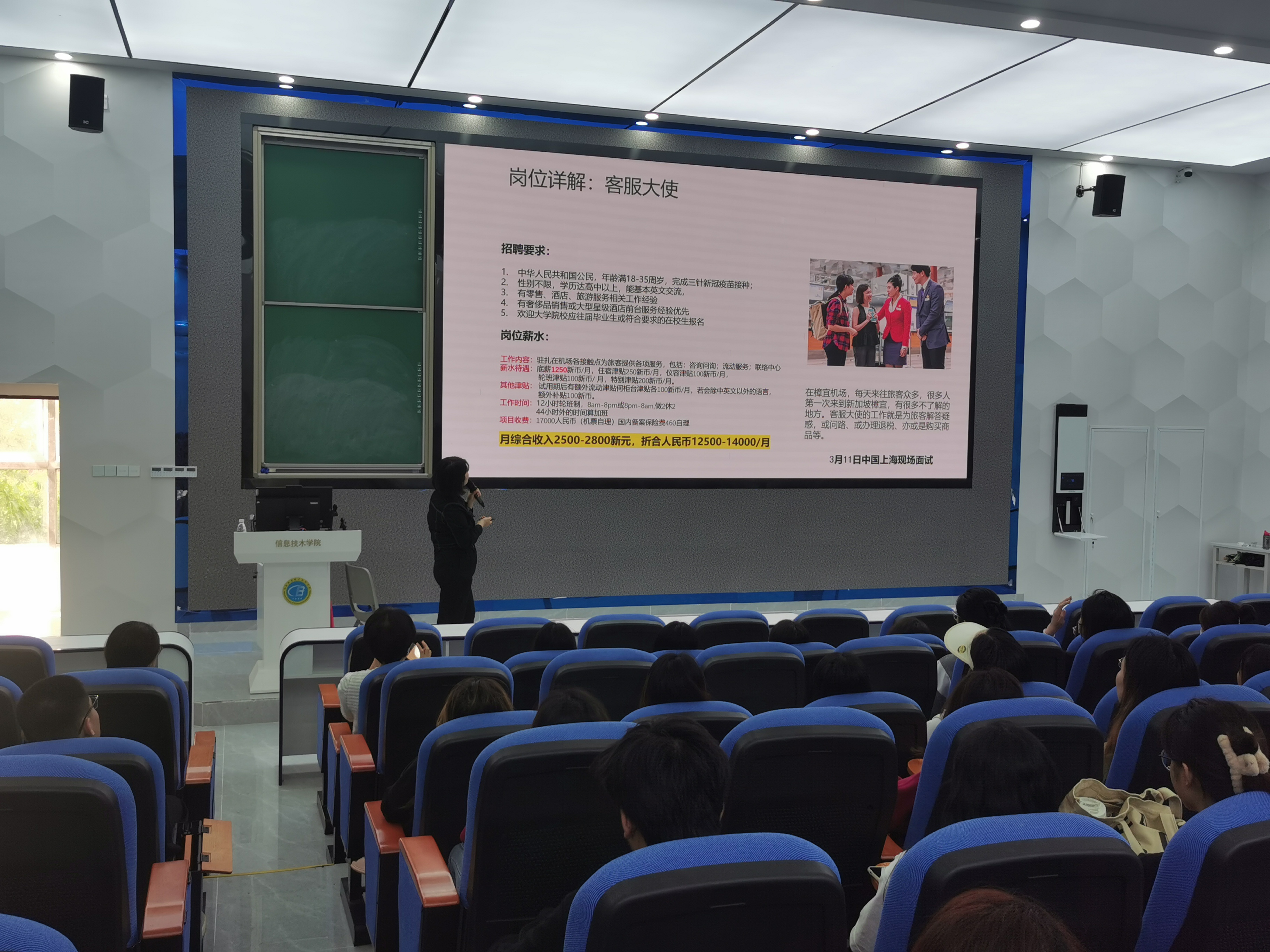 本次企业宣讲人是来自中澜公司的校企项目部经理高茜玲。高经理重点介绍了新加坡樟宜机场地勤客服人员、樟宜机场免税店销售人员、樟宜机场体验大使三个岗位的招聘要求和岗位职责与薪水等。
