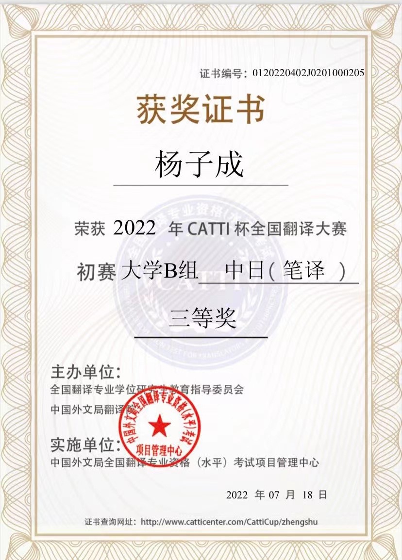 喜报:杨子成获2022年CATTI杯全国翻译大赛初赛大学B组中日(笔译)三等奖