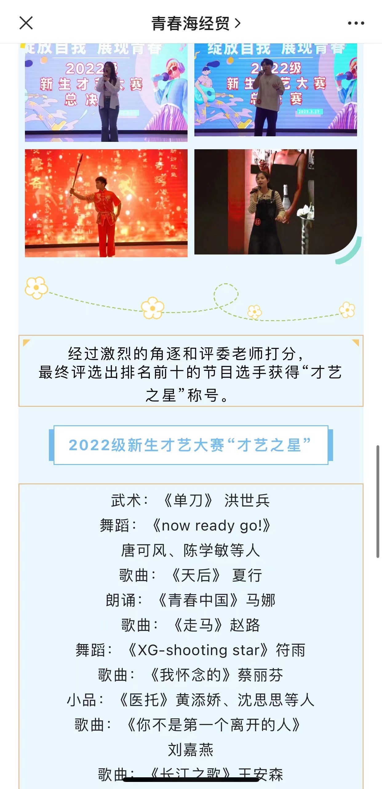 在2023年3月17日晚举行的海经贸2022级新生才艺大赛中,22级应用日语2班马娜同学,在朗诵《青春中国》中表现出色,展现出了当代大学生的活力和风采,荣获“才艺之星”荣誉称号。