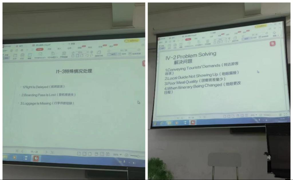 旅游+英语特训营主要以“旅游名胜以及旅游团的危机处理”为主题展开学习。特训营邀请海南省著名的资深高级英文导游李永泉老师为同学授课,同学们首先进行了家乡介绍,有的同学来自千里冰封、万里雪飘的北方,有的来自日出江花红似火、春来江水绿如蓝的南方。通过介绍家乡,我们了解了各地的名胜景点。通过李老师的讲解,我们认识到,作为世界文明古国之一的中国,有着悠久的文化历史传统,祖国的人文历史,民族风情,山水名胜等独天得厚的条件都吸引着来自世界各地的旅游爱好者们。李老师还针对旅游团中的突发情况及如何解决进行了讲解,拓宽了同学们的视野。