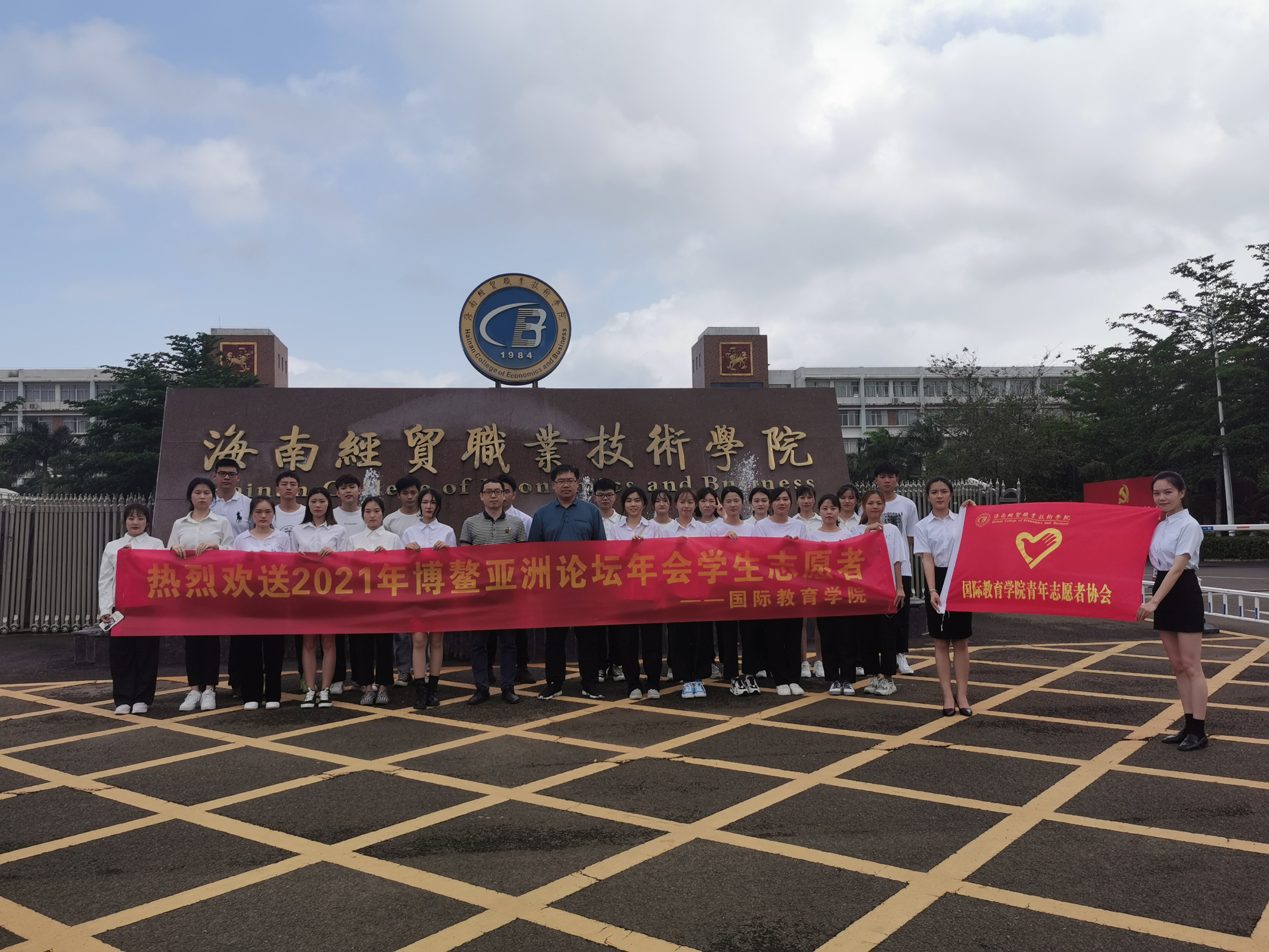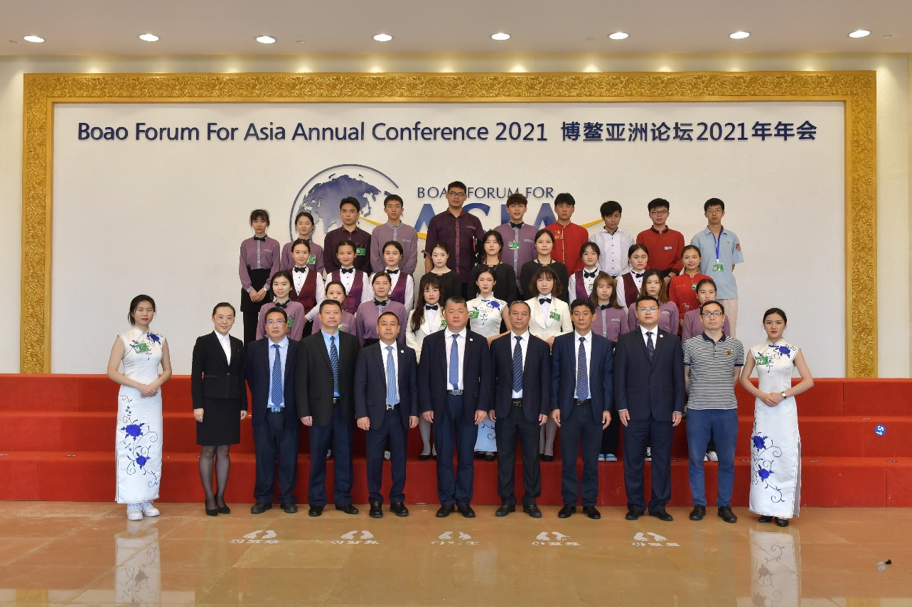 带队老师黄银亮老师及我院志愿者在博鳌亚洲论坛2021年年会合影留念