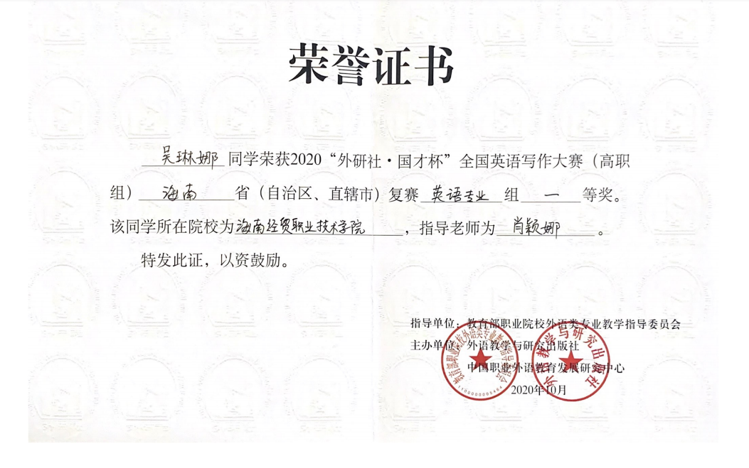 吴琳娜同学在肖颖娜老师指导下荣获2020"外研社·国才杯"全国英语写作大赛(高职组)海南赛区复赛英语专业组一等奖;