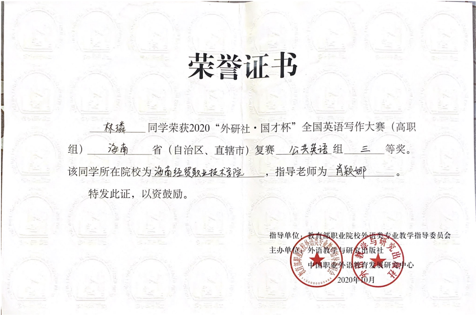 林璘同学在肖颖娜老师指导下荣获2020"外研社·国才杯"全国英语写作大赛(高职组)海南赛区复赛公共英语组三等奖。