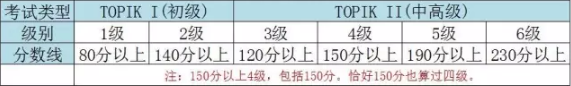 韩国语能力考试分为初、中、高三个等级,报名时分为Ⅰ级(1-2级)、Ⅱ级(3-6级),初级满分200分,中高级满分300分,根据得分划定等级。
