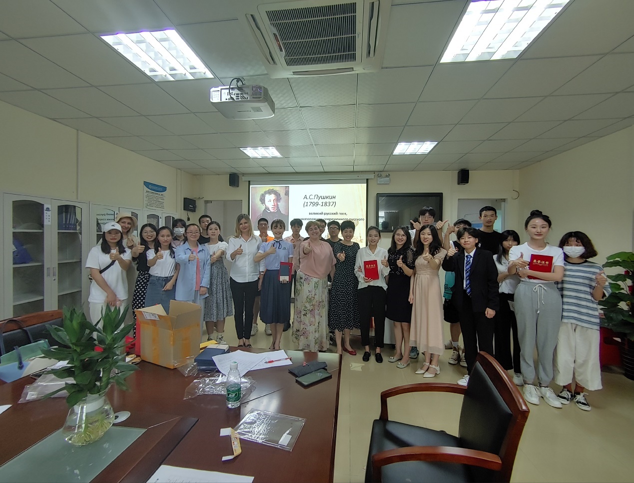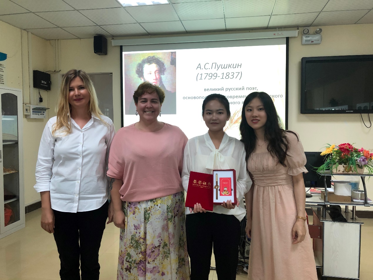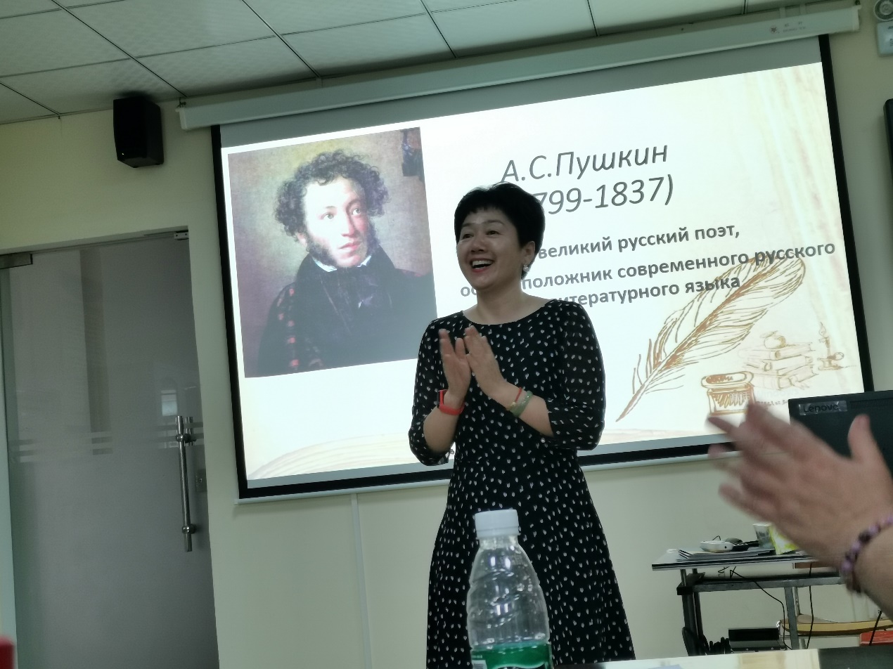 比赛接近尾声,应用俄语专业负责人周丽霞老师向黄梓瑶、阿纳斯塔西娅等老师对本次比赛筹备工作的支持表示感谢并给学生的表现给予了极大肯定,她总结到:经过此次大赛,学生们不仅展示了自己的俄语水平,而且结识了著名俄国诗人普希金。学生们也很勇敢,他们的表现真让我感到惊喜,学习俄语并不容易,说明学生很努力,老师们也很敬业!