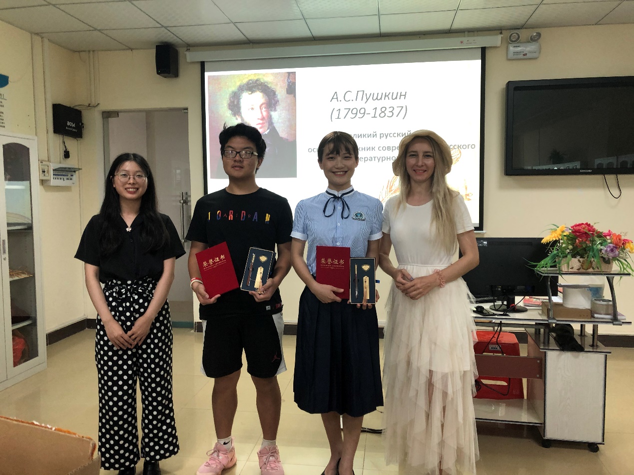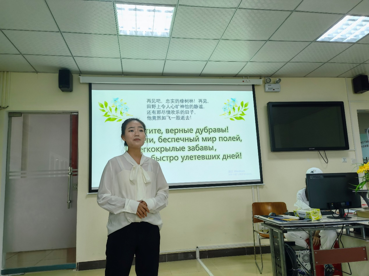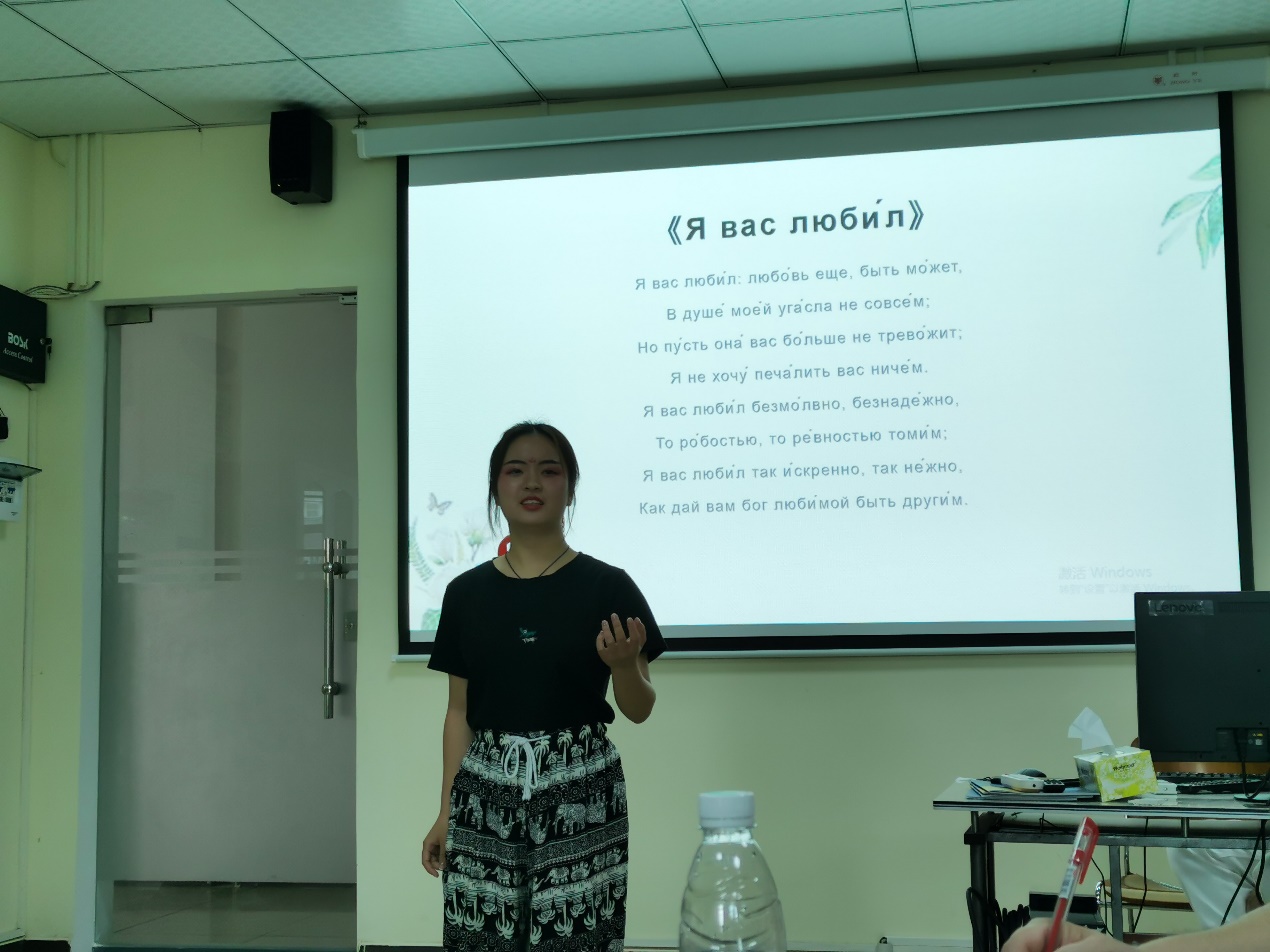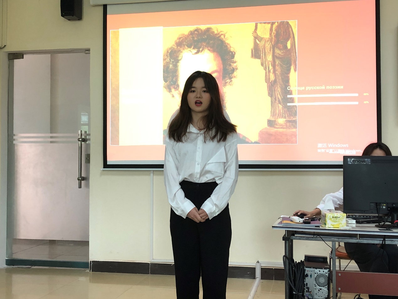本次比赛选取的是俄罗斯伟大诗人,现代俄语奠基人普希金的诗歌。外籍教师阿纳斯塔西娅向学生们详细介绍了诗人普希金及其在俄罗斯的重要地位,俄语教师黄梓瑶进行翻译。