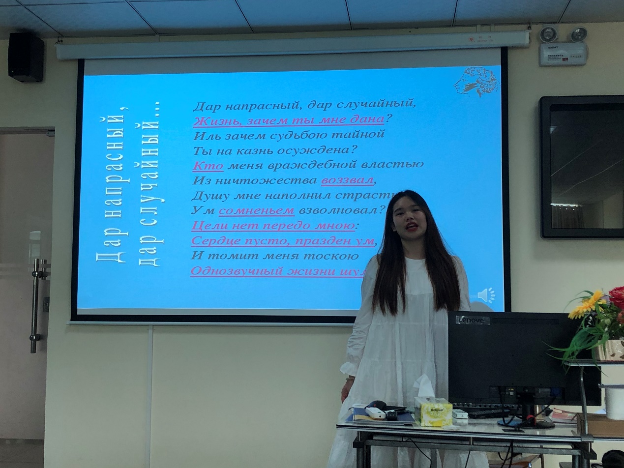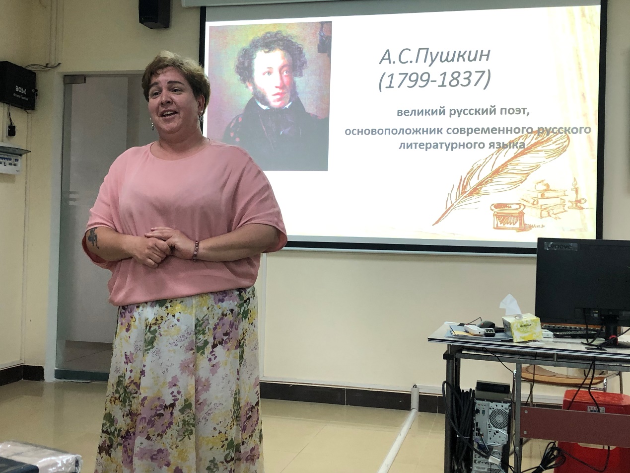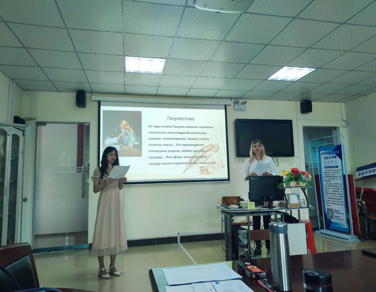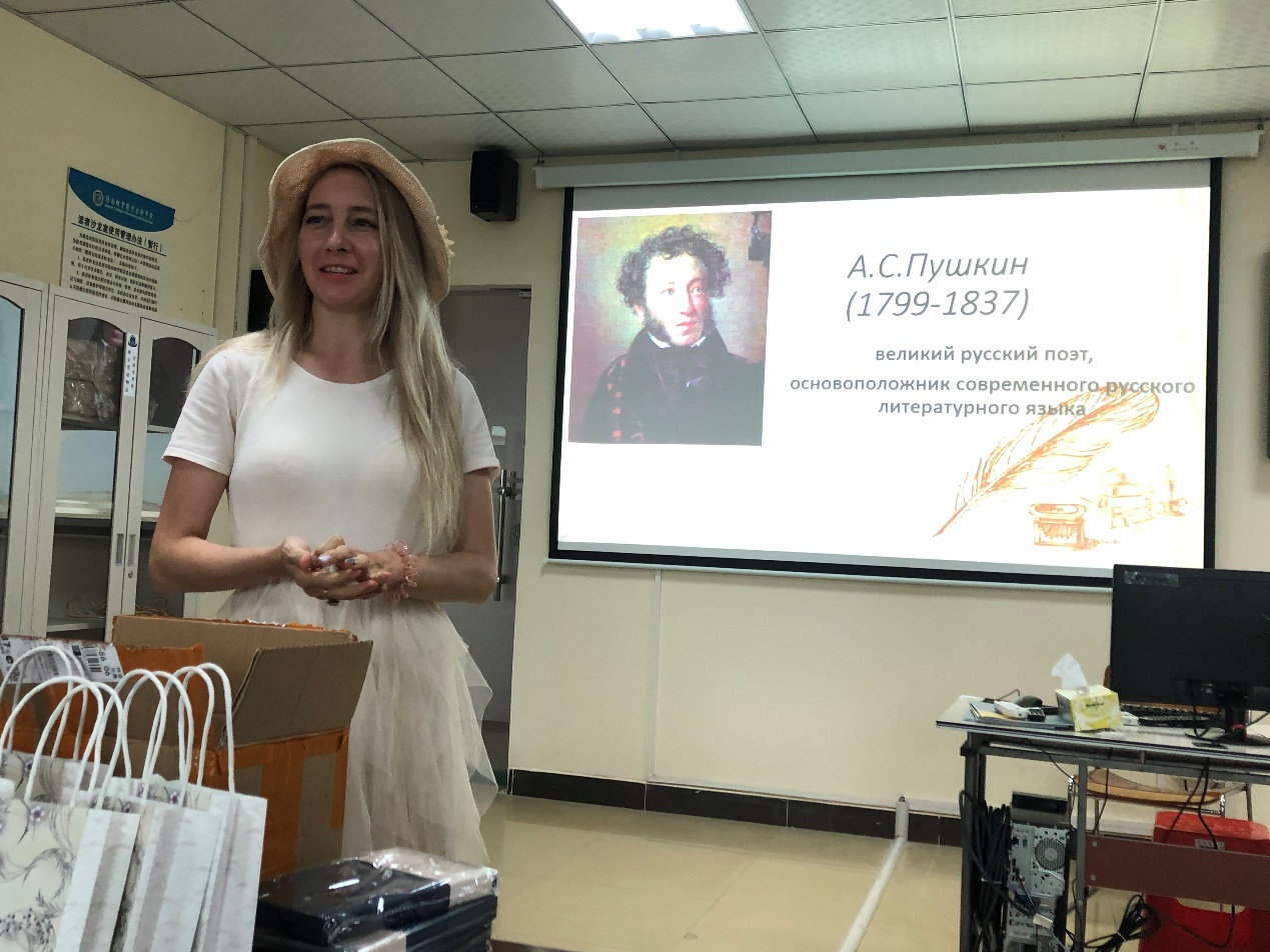 本次比赛选取的是俄罗斯伟大诗人,现代俄语奠基人普希金的诗歌。外籍教师阿纳斯塔西娅向学生们详细介绍了诗人普希金及其在俄罗斯的重要地位,俄语教师黄梓瑶进行翻译。