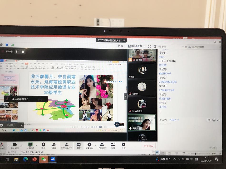 2022年9月20日俄语教研室采用线上线下相结合的方式举行2022级新生见面会,周丽霞副院长、俄语教师陈洁千子、外籍教师Anastasia、Iria在俄罗斯风情教室线下参会,俄语教师黄梓瑶、外籍教师Elina以及2022级全体应用俄语专业新生通过线上方式参加了本次见面会。本次会议还特别邀请到了19俄语班学生张琪、20俄语班学生廖馨月、海南贝加尔英国正版365官方网站有限公司总经理15级俄语班李彬彬、南山迎宾馆前厅部经理14级俄语班刘小妹在线分享学习经验和行业前沿资讯。整场会面异彩纷呈,丰富多彩。