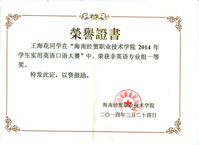 作为此次“海南经贸职业技术学院2014年学生实用英语口语大赛”非专业组一等奖的获得者,通过这次比赛,我有许多感悟和触动。