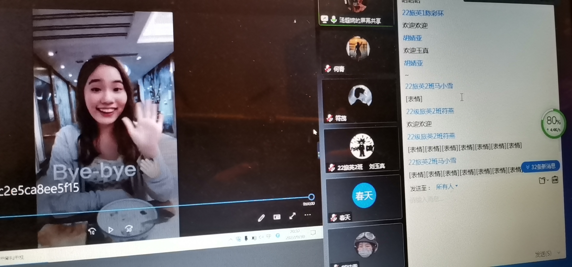 还有最后一位神秘嘉宾,原来是何春老师,相信已经有不少小伙伴猜到啦!没想到何春老师真是多才多艺,自己是英语老师,同时还会日语,没想到还会民族舞!何春老师还让同学们找找视频里哪个是她,这可难不倒大家,正确答案马上就出现在了公屏上。何春老师直呼同学们太厉害了!