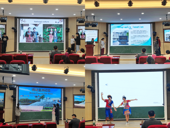 比赛过程中,八个小组围绕海南五大特色景点——东坡书院、骑楼老街、槟榔谷、博鳌亚洲论坛、中国雷琼海口火山群世界地质公园展开激烈角逐。选手们深入挖掘所选景点的独特之处,凭借扎实的英语功底和出色的导游技巧,将海南的自然风光、历史文化与民俗风情一一呈现。有的小组以东坡书院为切入点,用富有诗意的语言讲述东坡居士的传奇故事以及书院的文化传承;有的聚焦骑楼老街,生动描绘南洋风格建筑背后的历史变迁与市井百态;还有的通过槟榔谷展示了海南黎族、苗族等少数民族的独特习俗与精湛技艺。另外,各小组还根据景点特色带来了歌曲、朗诵、舞蹈等精彩的才艺表演,赢得了台下观众的阵阵掌声与喝彩,现场气氛热烈非凡。