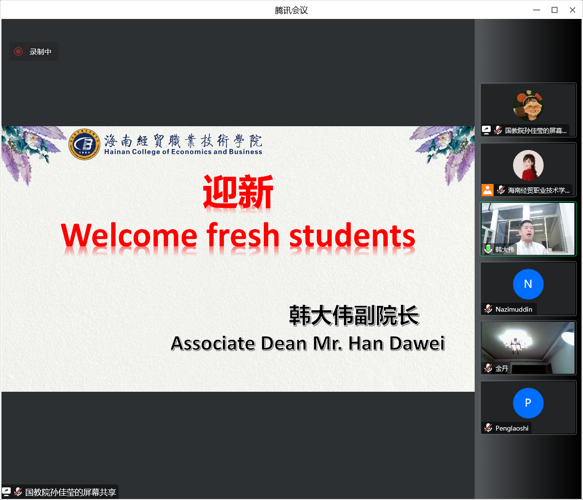 首先,国际学院韩大伟副院长对2022级国际学生新生们的到来表示热烈的欢迎,欢迎大家加入海南经贸职业技术学院,成为其中的一员,并对新生寄予希望,鼓励大家努力学习,获取知识,收获快乐!