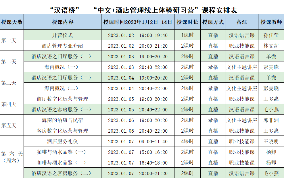 海南经贸职业技术学院创建于1984年,是一所以培养经贸类高素质技术技能人才为主的国有公办高校。“中文+酒店管理线上体验研习营”是我校承办的“汉语桥”线上团组交流项目,旨在让国际学生在学习中文知识的同时,掌握酒店管理与数字化运营专业职业技能。项目为期12天,免费学习,学员完成课程后颁发结业证书,表现优异的学员还可获得“优秀学员”证书。