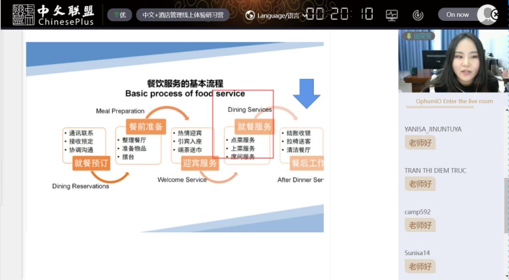 截至2023年1月8日,课程已经过半,“中文+酒店管理”线上体验研习营的直播课程与录播课程均受到了学员们的热情参与。在酒店汉语系列课程中,学员们已经完成了与酒店前厅部、客房部、餐饮部有关的汉语言知识的学习。学员的参与度较高,其汉语水平也得到了授课老师的一致认可。大家在课上积极回答问题,课后按照老师的要求认真提交作业,做到了“学有所获”、“学有所得”。