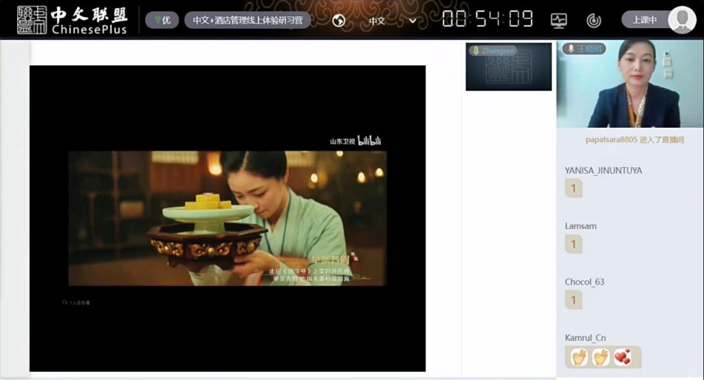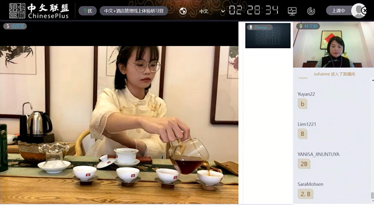 在直播的职业技能课程中,学员们也顺利完成了和酒店数字化运营与管理有关的《前厅数字化运营与管理》、《酒店服务礼仪》、《中华茶艺与品鉴》以及《酒店数字化营销实务》部分课程的学习。专业课程的学习内容设置合理,有专门的翻译老师进行交传翻译。学员们主动参与课堂活动,积极与授课老师进行互动,课堂氛围非常融洽。授课老师专业的态度受到了学员们的广泛赞誉。