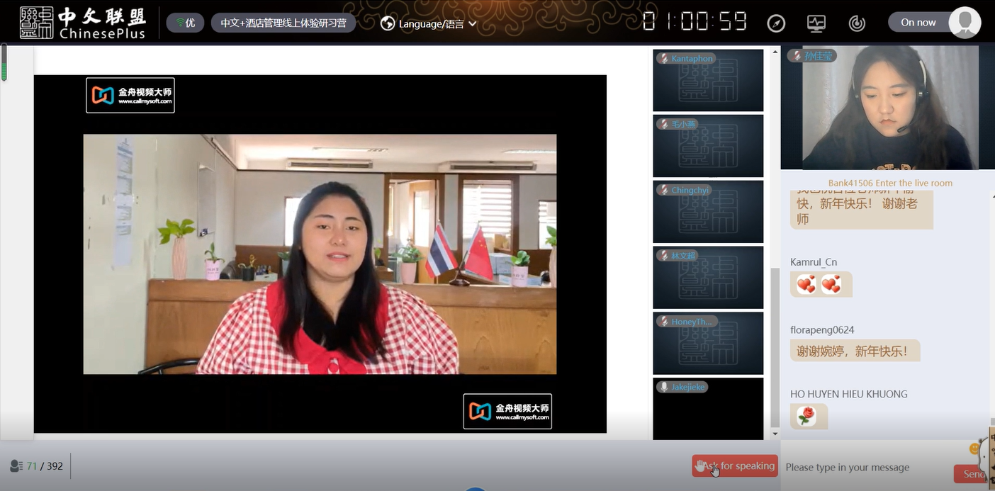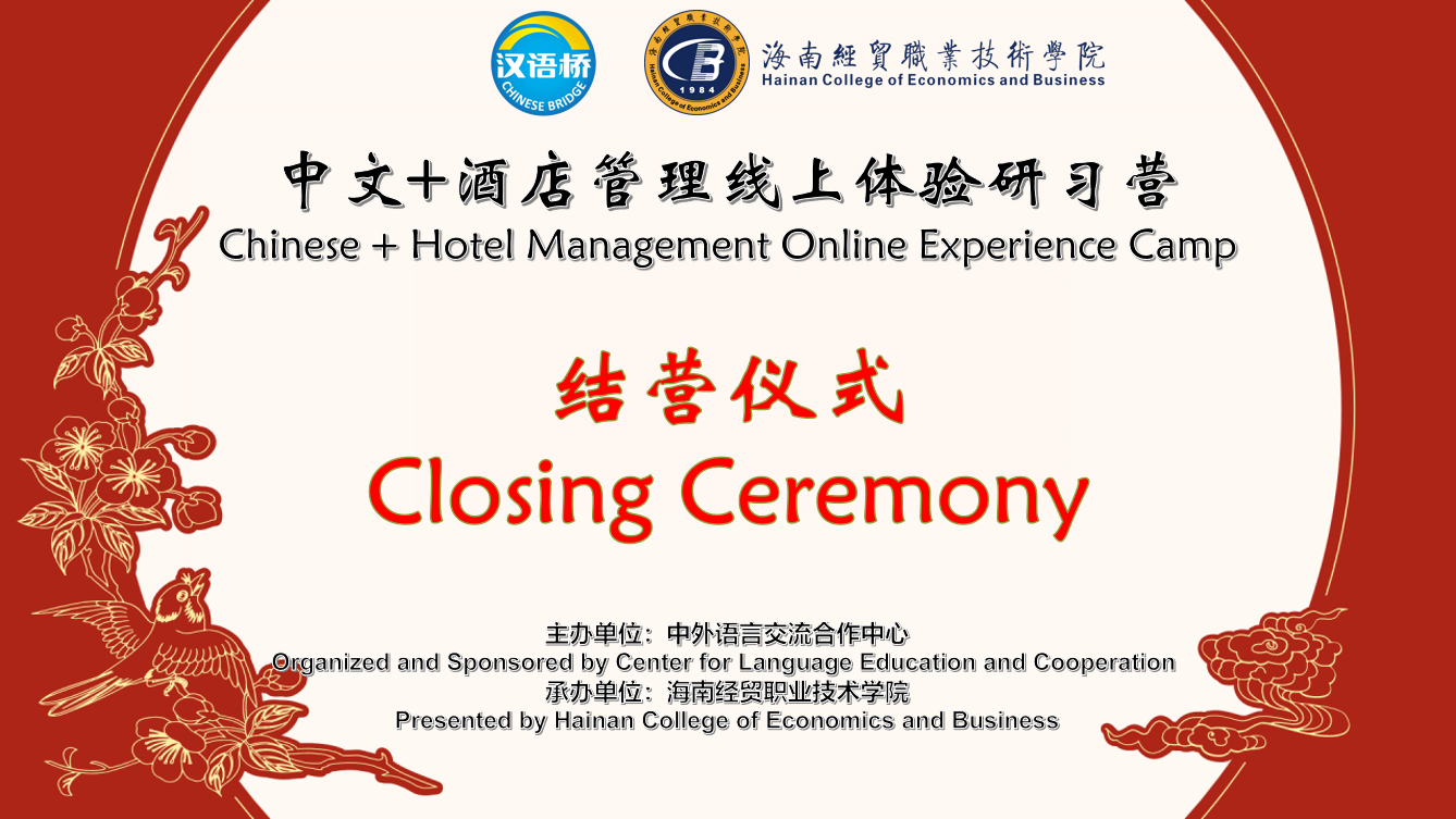 2023年1月14日北京时间19:00,由教育部中外语言交流合作中心主办、海南经贸职业技术学院承办的2022年“汉语桥”线上团组交流项目——“中文+酒店管理”线上体验研习营历时13天,顺利结营。