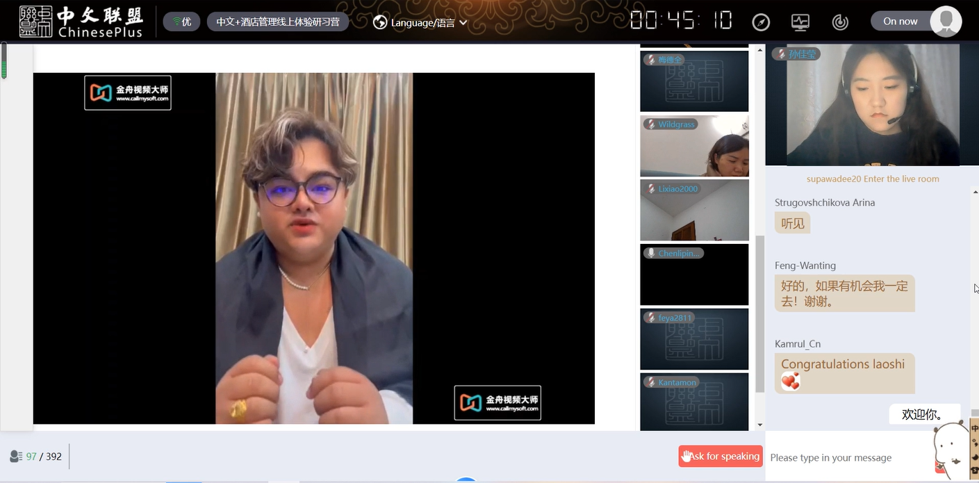 国际旅游学院酒店数字化运营与管理专业负责人(留学生)林文超老师作为教师代表在结营仪式上发言,用了四个词对本次“中文+酒店管理”线上体验研习营做了全面的回顾:“期待”、“喜悦”、“感谢”和“祝愿”,最后对所有的营员们表达了中国春节的祝福,并诚挚地邀请大家来海南,来海经贸参观、学习。