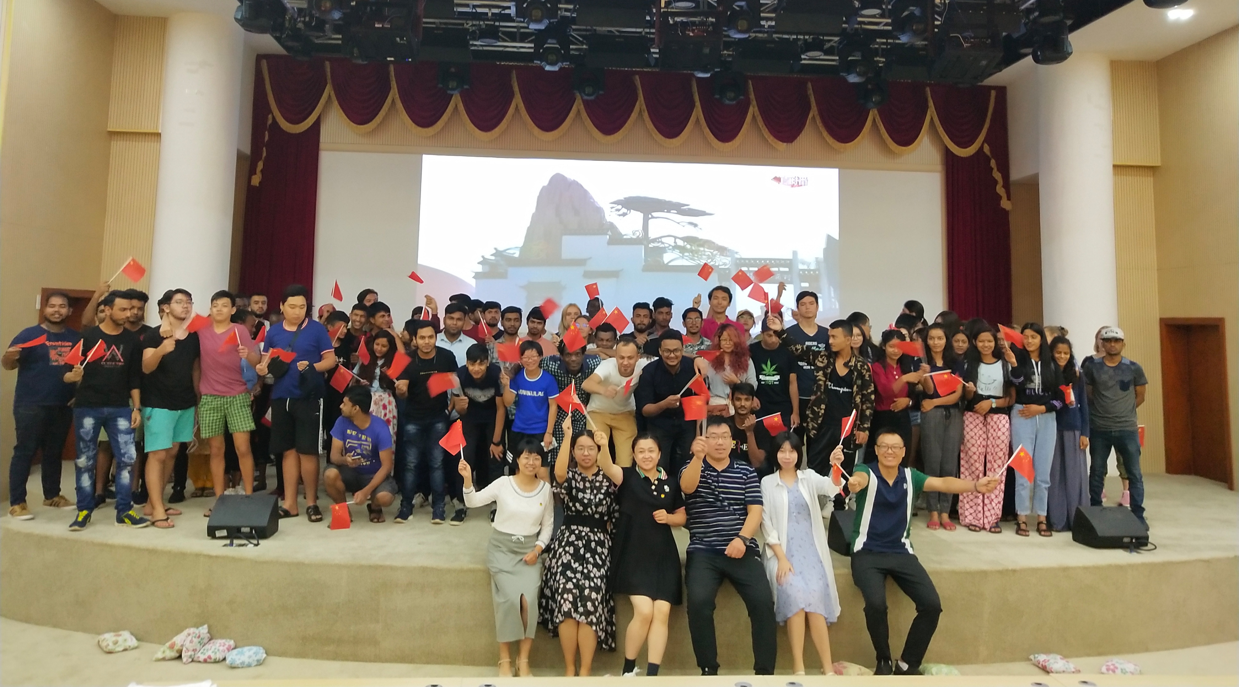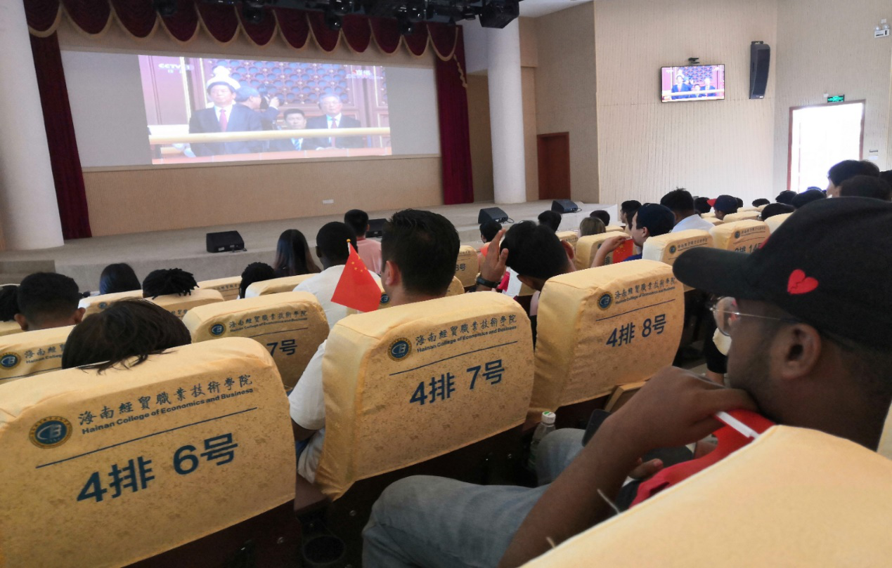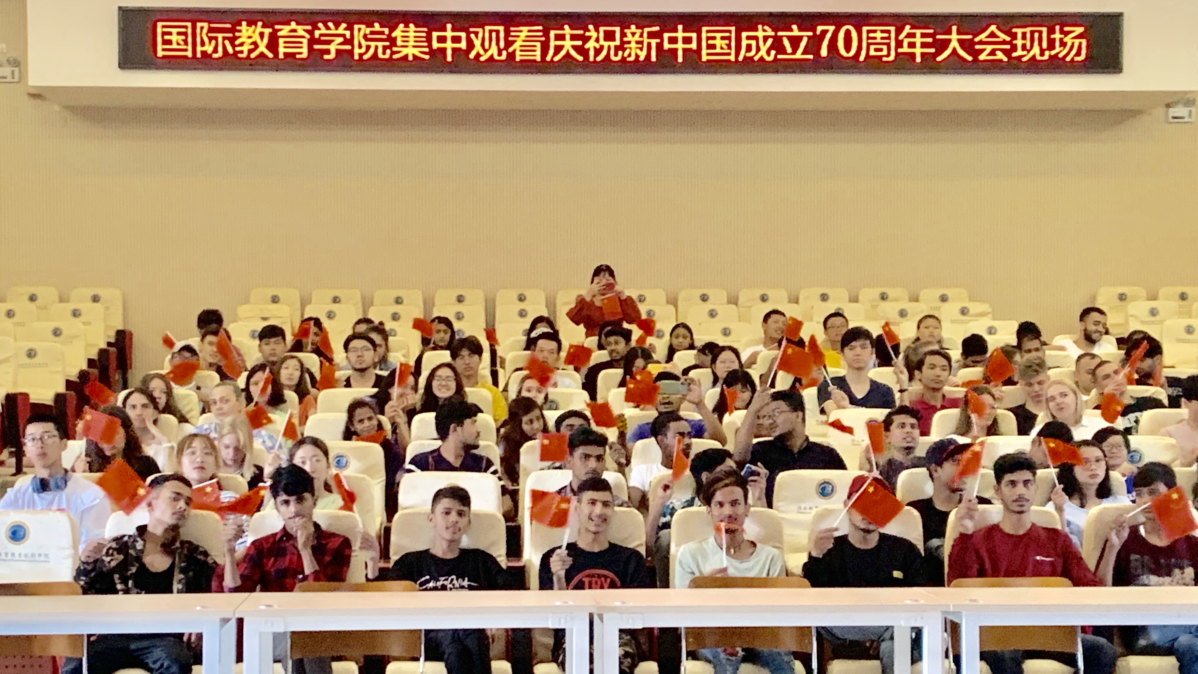 伴随着盛大的阅兵式和群众游行直播画面,学术报告厅也洋溢着喜庆、热烈的气氛,国际学生们不断感叹:“哇,中国,好强大!”“中国,真伟大!”,国际学生的激动心情溢于言表,集中收看现场掌声更是一浪接一浪。集中收看结束后,国际学生们纷纷表示,这是他们第一次观看中国的阅兵和庆祝活动,感觉太震撼了,为新中国成立70年来取得的举世瞩目的成就而惊叹,为自己能到中国留学而自豪。同时,也感谢中国为他们提供的留学机会,让他们真正深入的认识中国、了解中国,爱上中国。许多同学表示,毕业以后希望能在中资企业工作,真正的在中国和他们的祖国之间架起友谊的桥梁。 图4-6 国际学生参加学院庆祝新中国成立70周年庆祝活动