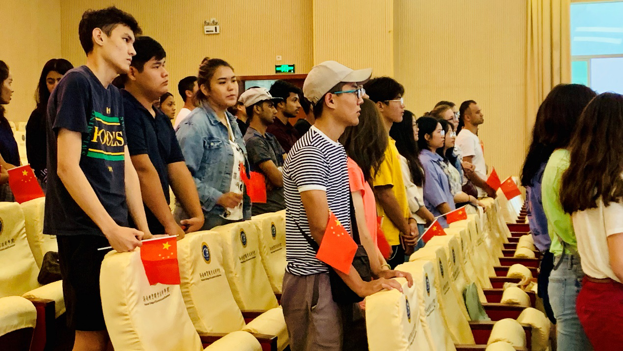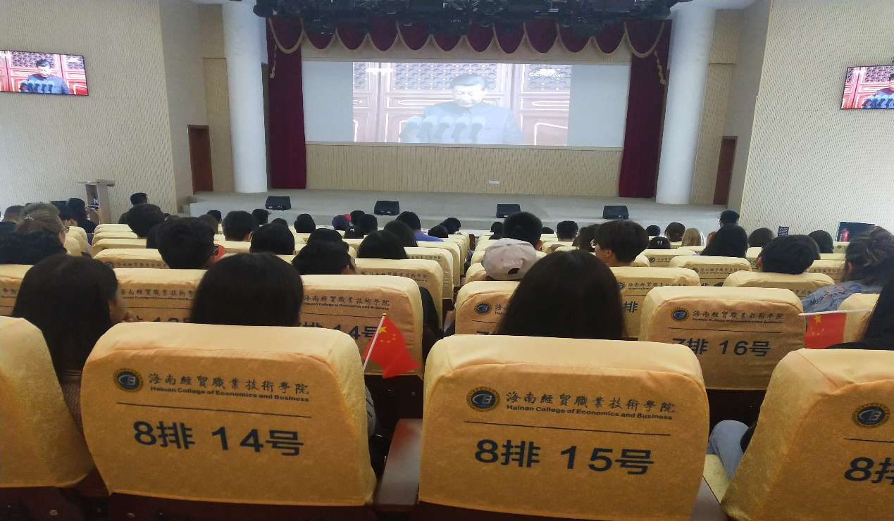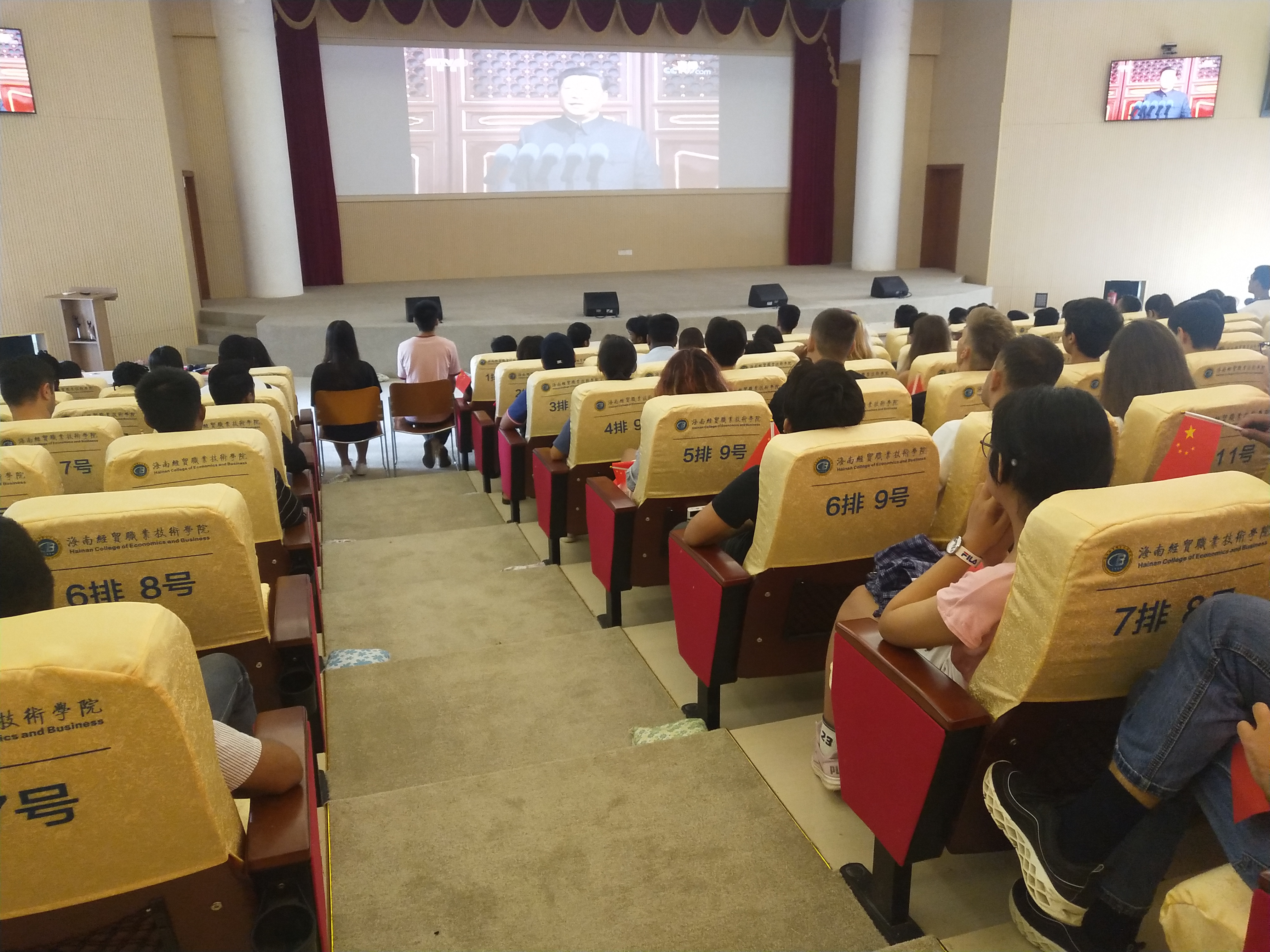 伴随着盛大的阅兵式和群众游行直播画面,学术报告厅也洋溢着喜庆、热烈的气氛,国际学生们不断感叹:“哇,中国,好强大!”“中国,真伟大!”,国际学生的激动心情溢于言表,集中收看现场掌声更是一浪接一浪。集中收看结束后,国际学生们纷纷表示,这是他们第一次观看中国的阅兵和庆祝活动,感觉太震撼了,为新中国成立70年来取得的举世瞩目的成就而惊叹,为自己能到中国留学而自豪。同时,也感谢中国为他们提供的留学机会,让他们真正深入的认识中国、了解中国,爱上中国。许多同学表示,毕业以后希望能在中资企业工作,真正的在中国和他们的祖国之间架起友谊的桥梁。 图4-6 国际学生参加学院庆祝新中国成立70周年庆祝活动