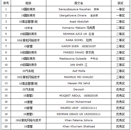 海南经贸职业技术学院2020年度国际学生书法比赛获奖名单