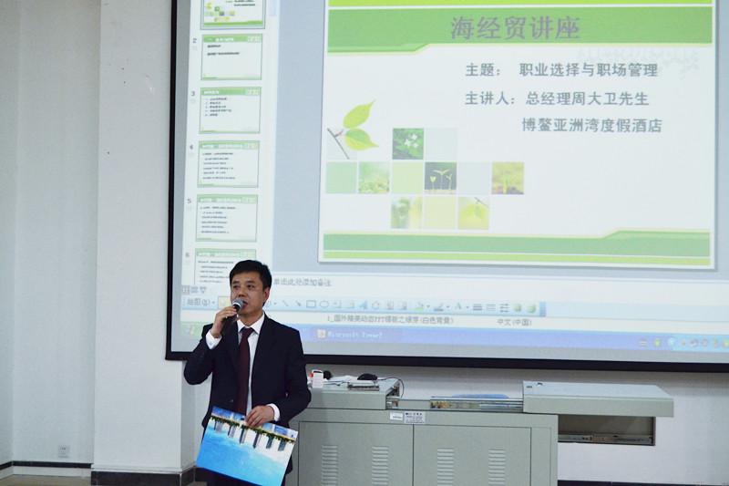 5月27日下午,应用外语系和人力资源协会邀请博鳌亚洲湾大酒店总经理开展“2014年就业专题讲座博暨亚洲论坛社会实践经验分享会”。