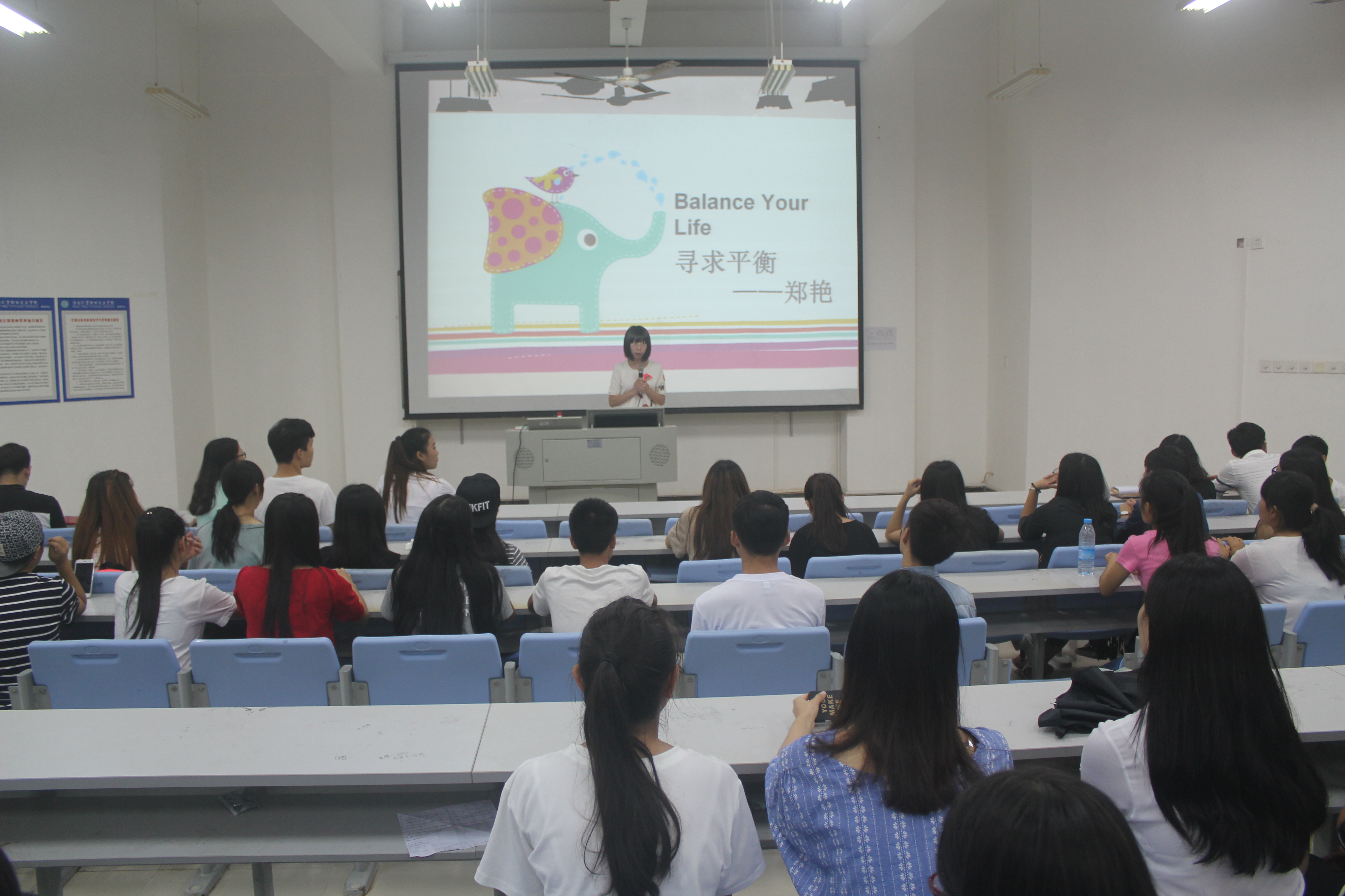 之后,郑艳老师给团学干部们做了“寻求平衡”的专题讲座。她向同学们阐释了“寻求平衡”的重要性和深刻意义,教我们如何寻求平衡,从如何寻求工作与学习的平衡、正面情绪与负面情绪平衡、人际交往(自我与他人)的平衡,以及接纳与反省的平衡四个方面分别给大家以良好的建议和指导。同时也希望同学们以加入团学通过锻炼不断完善自己为最终目标。最后,还建议大家在空余时间阅读迈克尔欣兹著作的一本书《平衡你的生活》,祝福大家能够有一个健康快乐的大学生生活。