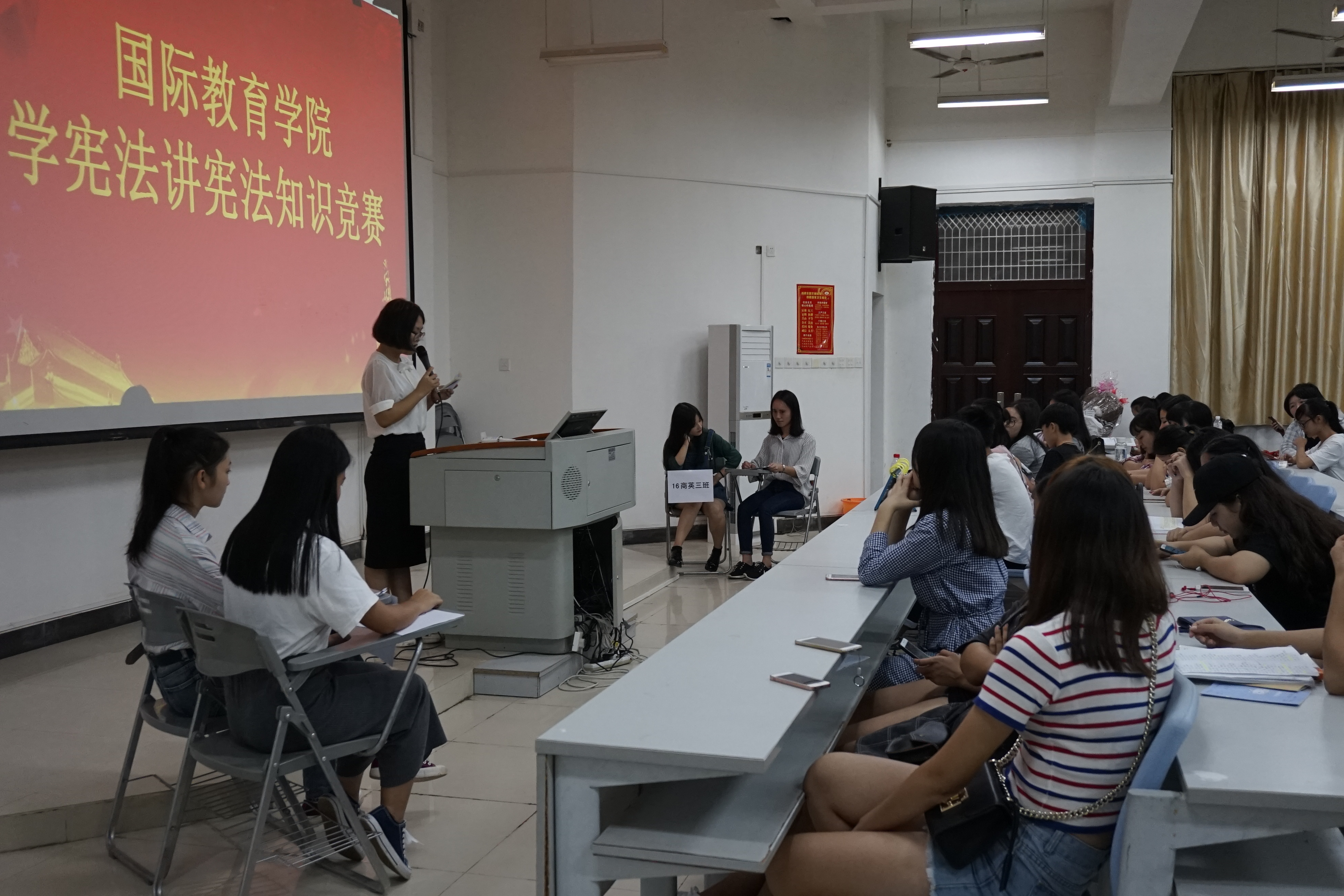 11月21日19:30,英国上市公司365团总支学生会在学工办的指导下,在1-421举办了"学宪法讲宪法"知识竞赛。在本次竞赛前一周,各个班级通过认真学习相关宪法知识,各自组织了班级同学们开展了“学宪法讲宪法”知识竞赛,选拔出每班2名代表参加学院的竞赛。此次竞赛的参赛人员为16级各班,每班2名代表参加比赛。