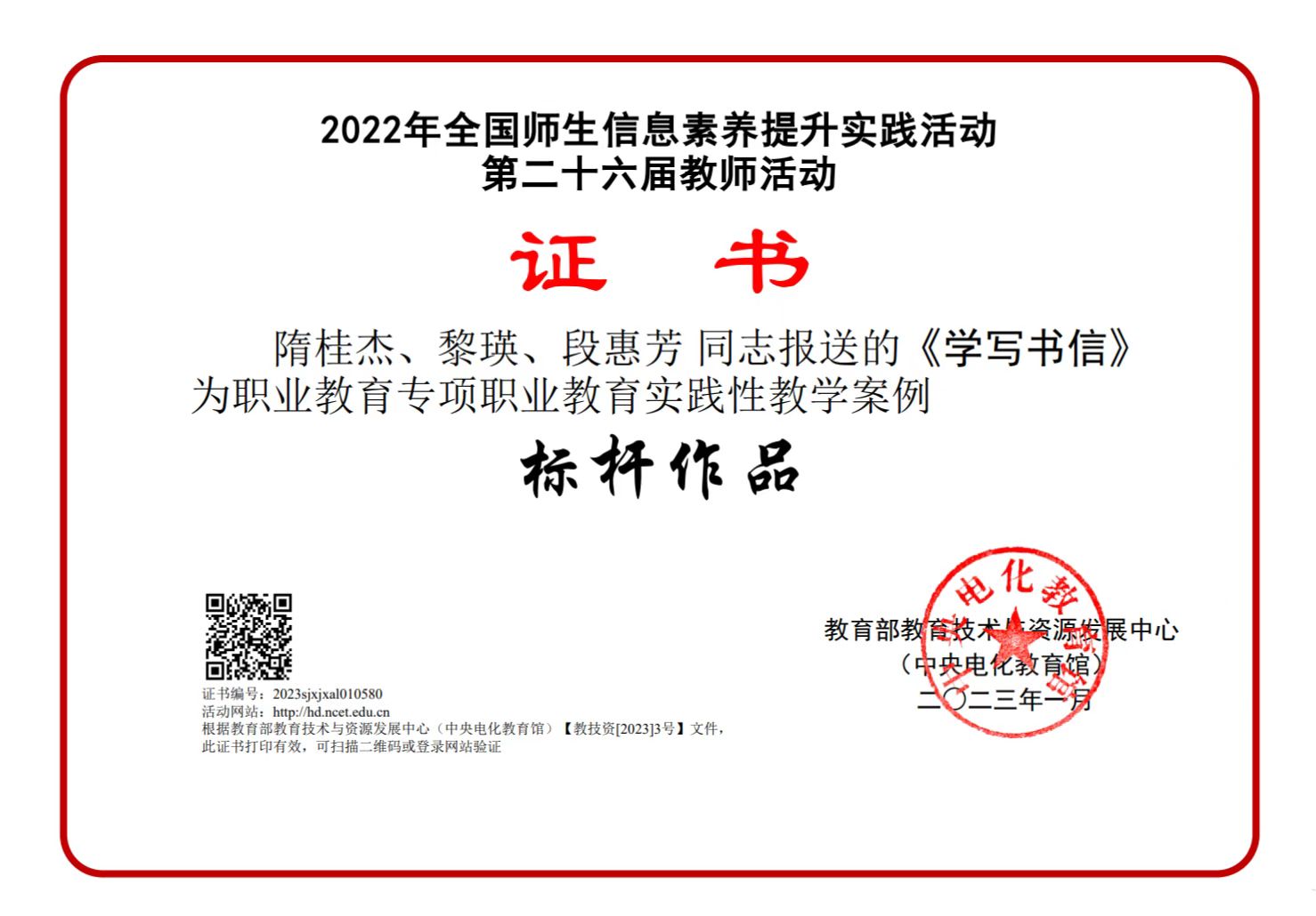 由教育部教育技术与资源发展中心(中央电化教育馆)主办的2022年全国师生信息素养提升实践活动(第二十六届教师活动)圆满落幕,我院教师隋桂杰、黎瑛、段惠芳团队报送的作品《学写书信》获评职业教育专项职业教育实践性教学案例标杆作品。这是我院首次组织教师参赛并首次获得该奖项。