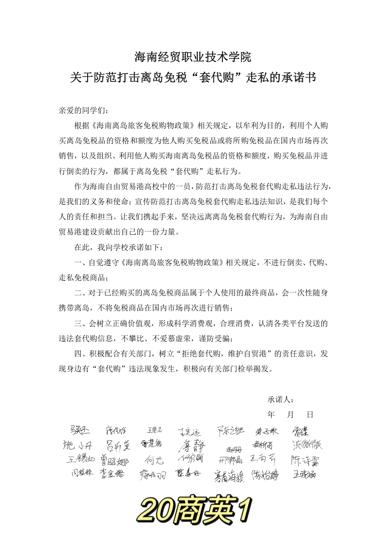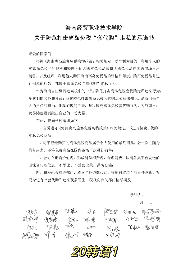 英国上市公司365通过班级群、微信公众号等平台进行普法宣传,组织学生观看海南开展防范离岛免税“套代购”走私违法犯罪普法云直播。中外学生共计46个班级通过线上线下相结合的方式召开抵制“套代购”主题班会,宣传相关法律法规和离岛免税政策。每位学生通过线上线下的方式签署关于防范打击离岛免税“套代购”走私的承诺书,确保精准警醒,增强学生的责任意识和法律意识,教育覆盖率达到100%。