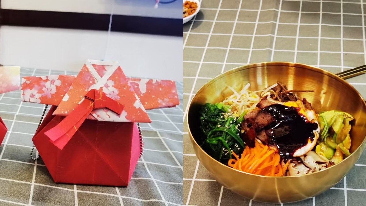 首先,韩语外教张智善老师为同学们讲解了用彩纸折韩服福袋的详细步骤,刘倩老师予以协助,同学们认真观摩聆听,积极动手尝试,在张老师和刘老师的指导下,同学们都折出了韩服形状的福袋,在此过程中,同学们既了解了韩国传统服饰的相关知识,又锻炼了动手能力。