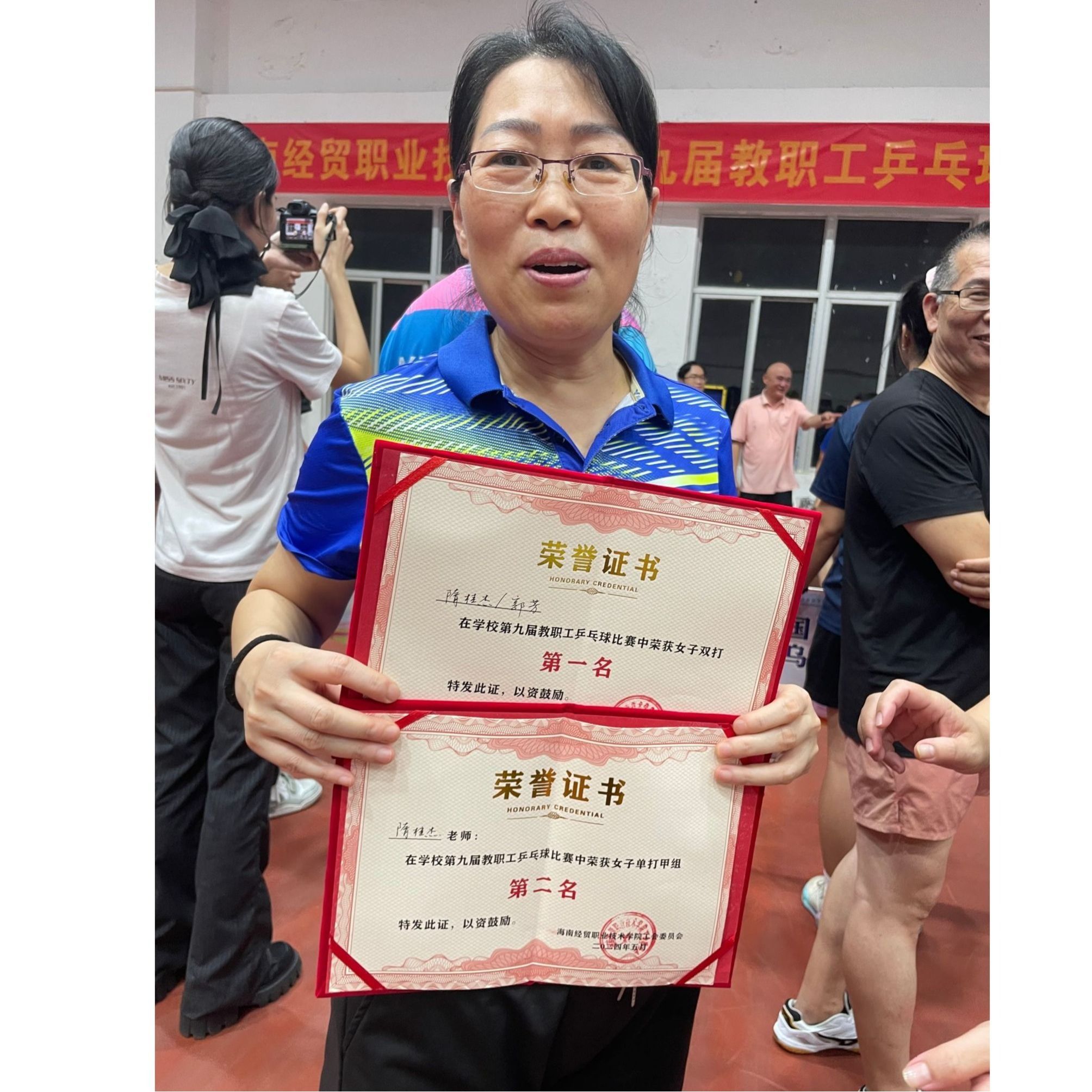特别值得一提的是,隋桂杰老师在本次比赛中大放异彩,凭借出色的球技和稳定的发挥,荣获女单第二名和女双第一名的优异成绩。她的精彩表现不仅为学院争得了荣誉,也赢得了在场观众的阵阵掌声和喝彩。
