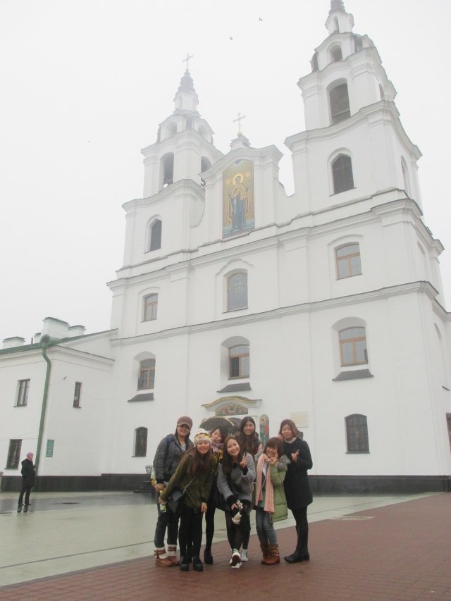 刚到明斯克的时候天还不是很冷,我们却穿着羽绒服下了飞机,着实成了一道“风景线”。出了机场看到了学长和中介姐姐,感觉又回到了大一刚入学的时候,也是学姐学长来接我们,有回忆也有感动。在去宿舍的路上我们没有了疲倦,都欣赏起车窗外明斯克金色的秋天,看到了蓝天、白云、白桦树和欧式风格小房子,呼吸着新鲜的空气感觉十分惬意。到了宿舍放下行李我们就去办了电话卡,然后学长带我们去买了些生活用品。接下来的几天就是我是熟悉环境的时间了,兰婷婷学姐带我们四处逛了下,还带我们去了教堂,我们玩的很开心。现在想想在陌生的国度有朋友在真好!